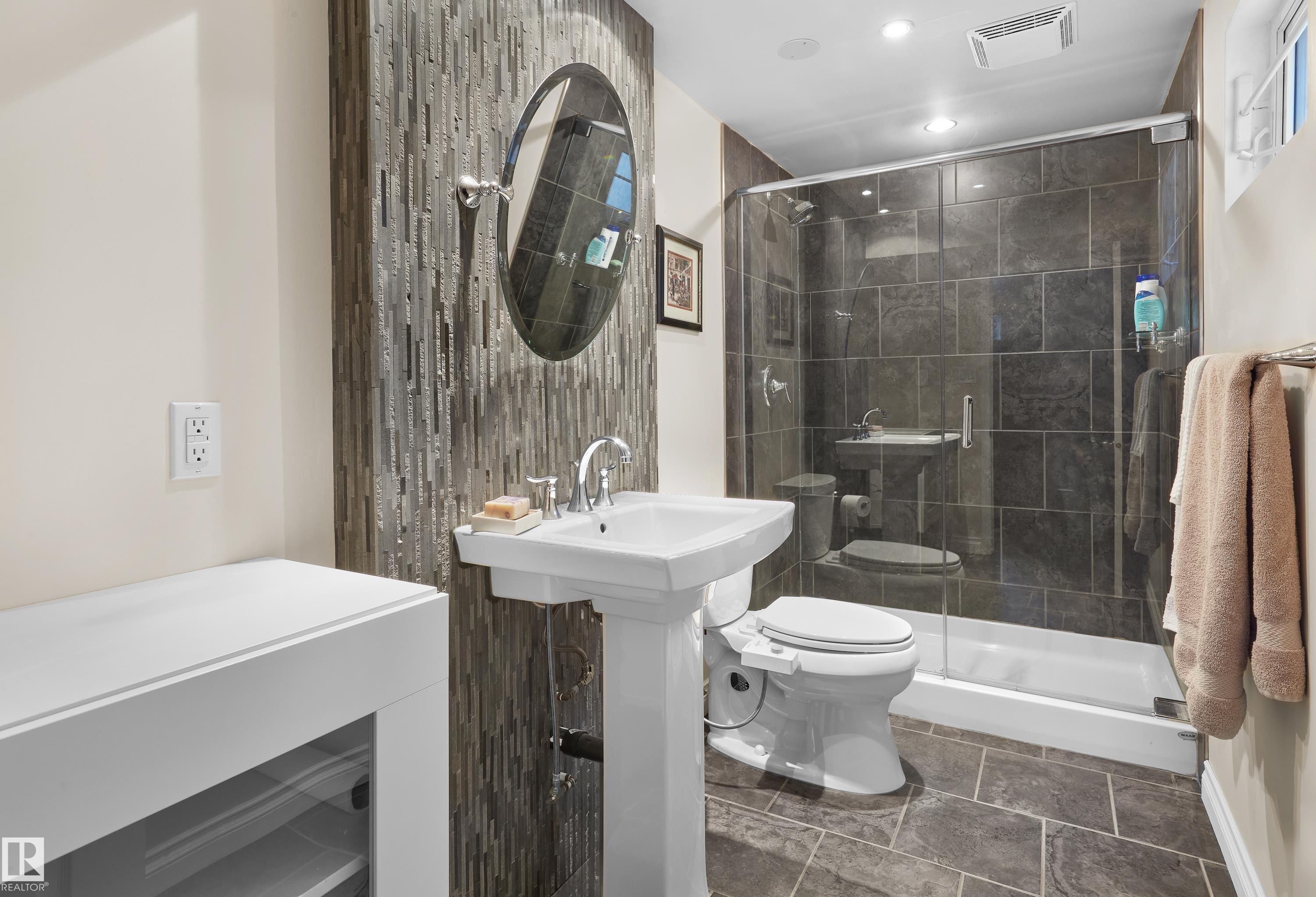 Beautifully renovated and filled with natural light, this stunning home sits on a quiet tree-lined street close to excellent schools, the University of Alberta & Downtown. Thoughtfully designed with large windows framing tranquil views of the surrounding greenery, every detail showcases pride of ownership. The stylish kitchen features stainless steel appliances and granite countertops, and a convenient breakfast bar, flowing seamlessly into the spacious dining area and open living room with gorgeous hardwood floors. Upstairs, the impressive primary suite offers a spa-like ensuite with a stand-alone soaker tub, double sinks, a glass shower, and private water closet. Two additional generous bedrooms and an upgraded bath complete the upper level.The lower level provides flexible living space with a cozy family room, large laundry area that doubles as a guest suite, and a beautiful full bath with glass shower. Air conditioning, a heated, double detached garage and RV parking complete this exceptional home.