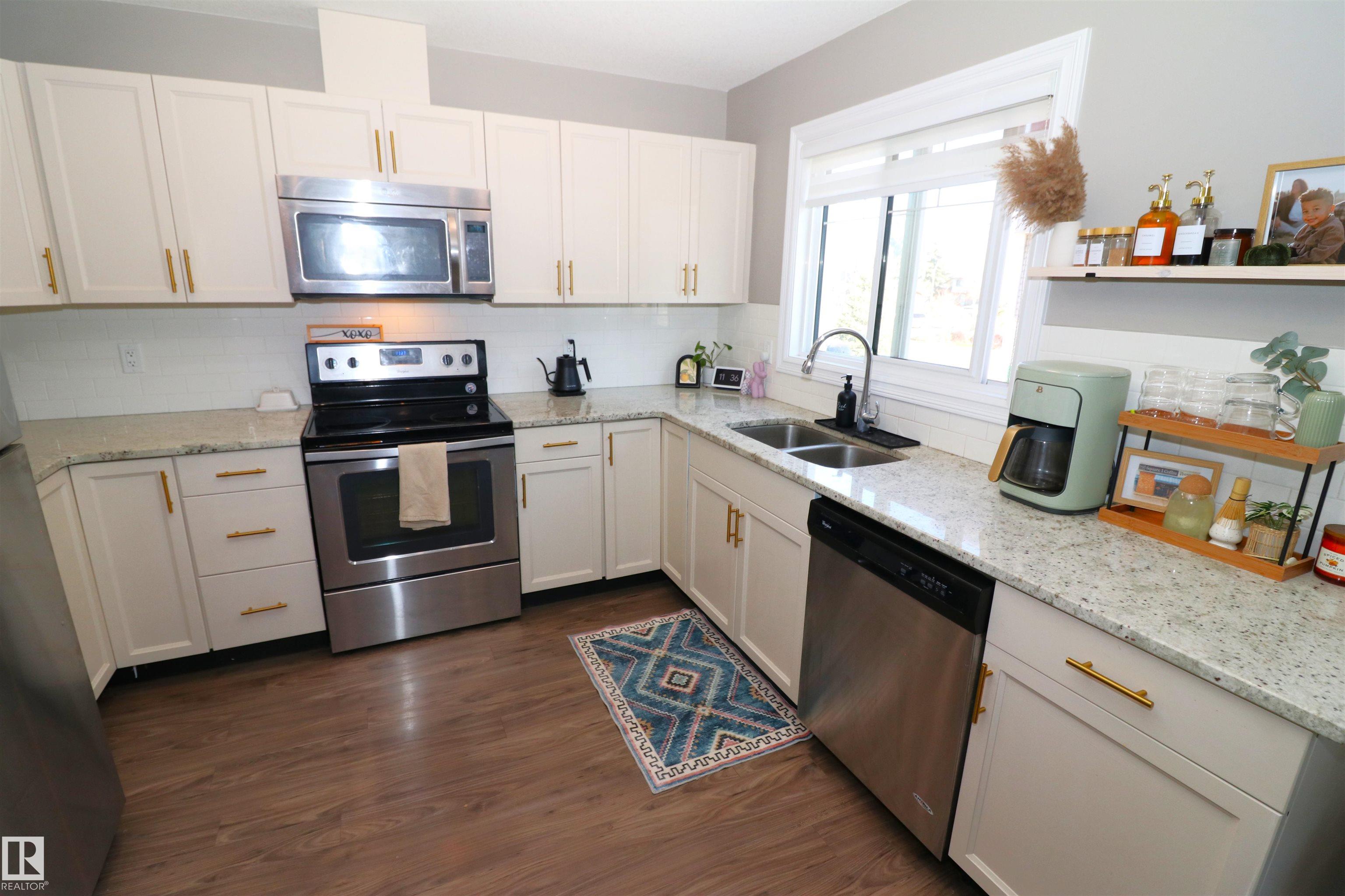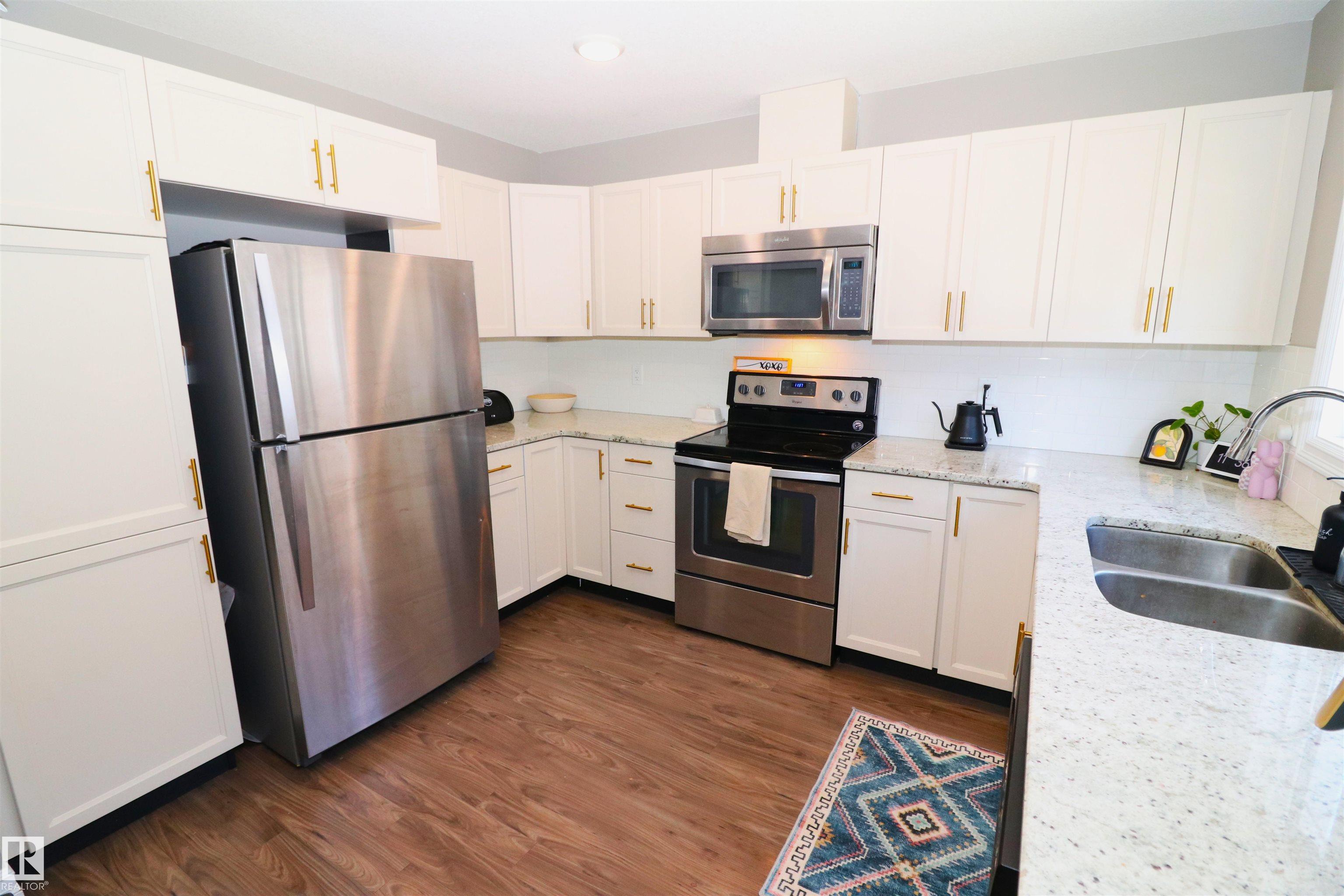 Gorgeous 3 bed 2.5 bath townhome with SW exposure facing onto Bearspaw Park & Lake! This unit has been updated with beautiful off-white kitchen cabinets, champagne bronze hardware, granite counters, subway backsplash & stainless steel appliances. There is an eating nook just off the kitchen and the living area is separated by a 2pc powder room & main floor laundry! Laminate floors throughout the main & modern paint with dark feature walls. Upstairs are 3 good sized bedrooms & 2 full baths. The basement is a big boot room with storage closets & houses utilities including an on-demand water heater. The DOUBLE GARAGE is attached with access from the basement. Fenced-in patio space to enjoy the sunshine & view of the scenic field. Great access to Bearspaw Lake & Blackmud Creek Ravine. 2 blocks from Keheewin Elementary School & Park with tennis, basketball & hockey rink community league.