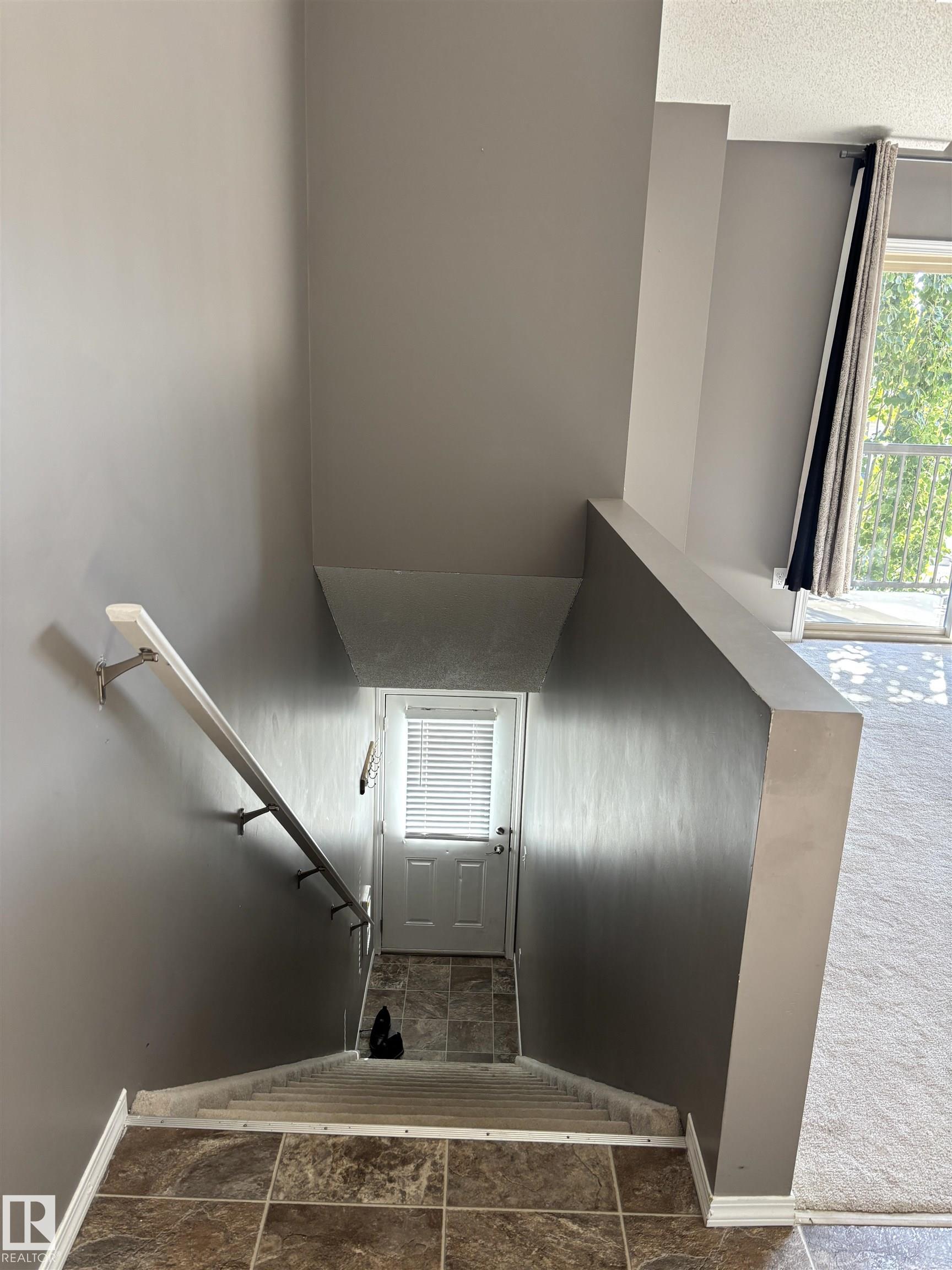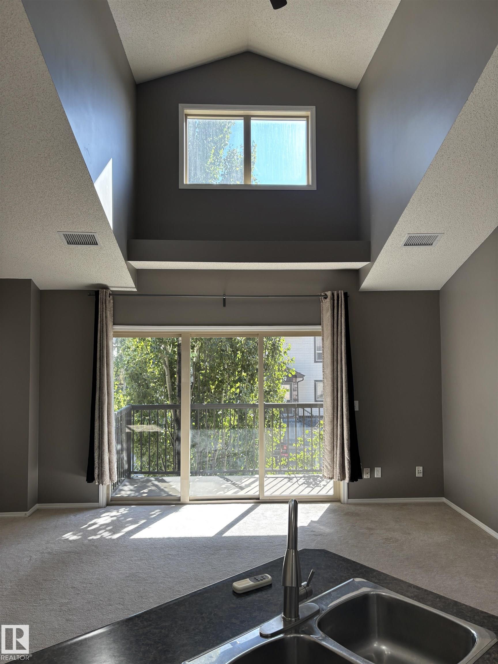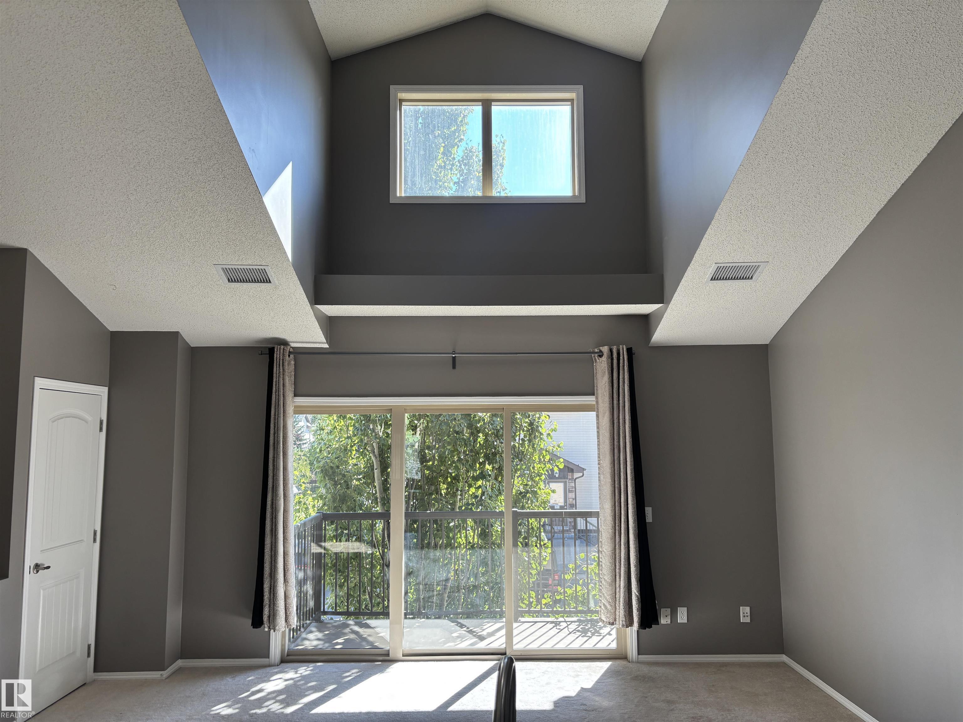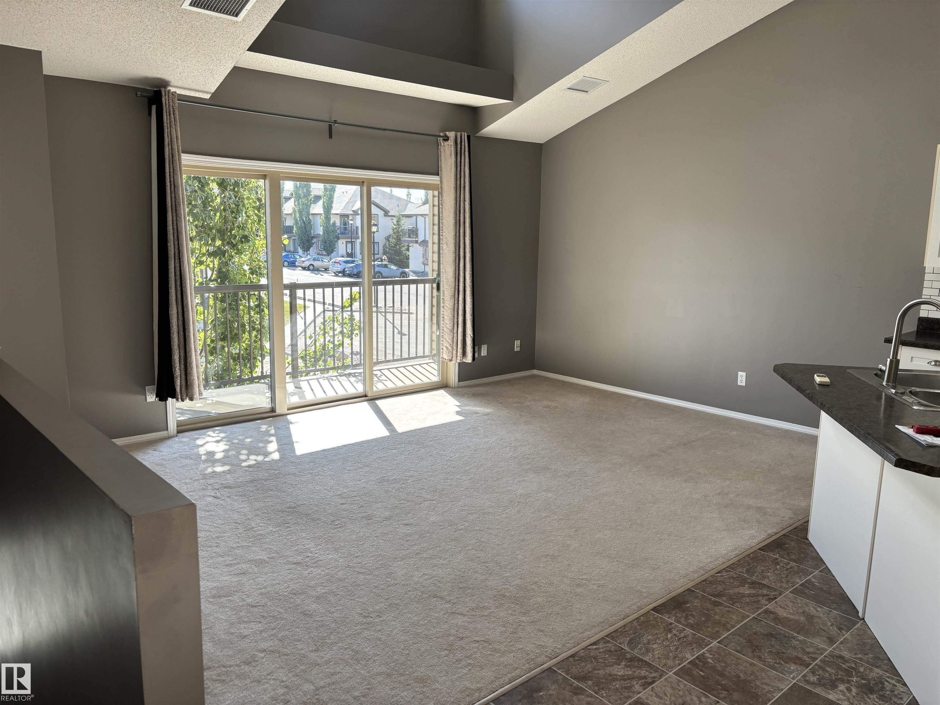 The beautiful SW community of CHARLESWORTH is where you will find this very well maintained TOP FLOOR carriage style home with two good-sized bedrooms and a full 4-piece bathroom. Walk up to the open concept layout, a large living room featuring VAULTED CEILINGS allowing natural light to flow right through the unit, and walks out onto the SOUTH facing deck . A dedicated spot for your kitchen table and chairs at the top of the stairs. The large kitchen features bright white cabinets with dark countertops, a timeless subway tile backsplash, black appliances, a sit-at-island, and a walk-in corner pantry. Additional features include a walk in laundry room with extra storage, a linen closet and even more storage above the staircase. Just south of the Anthony Henday, and walking distance to HARVEST POINTE shopping center that has all your daily amenities.