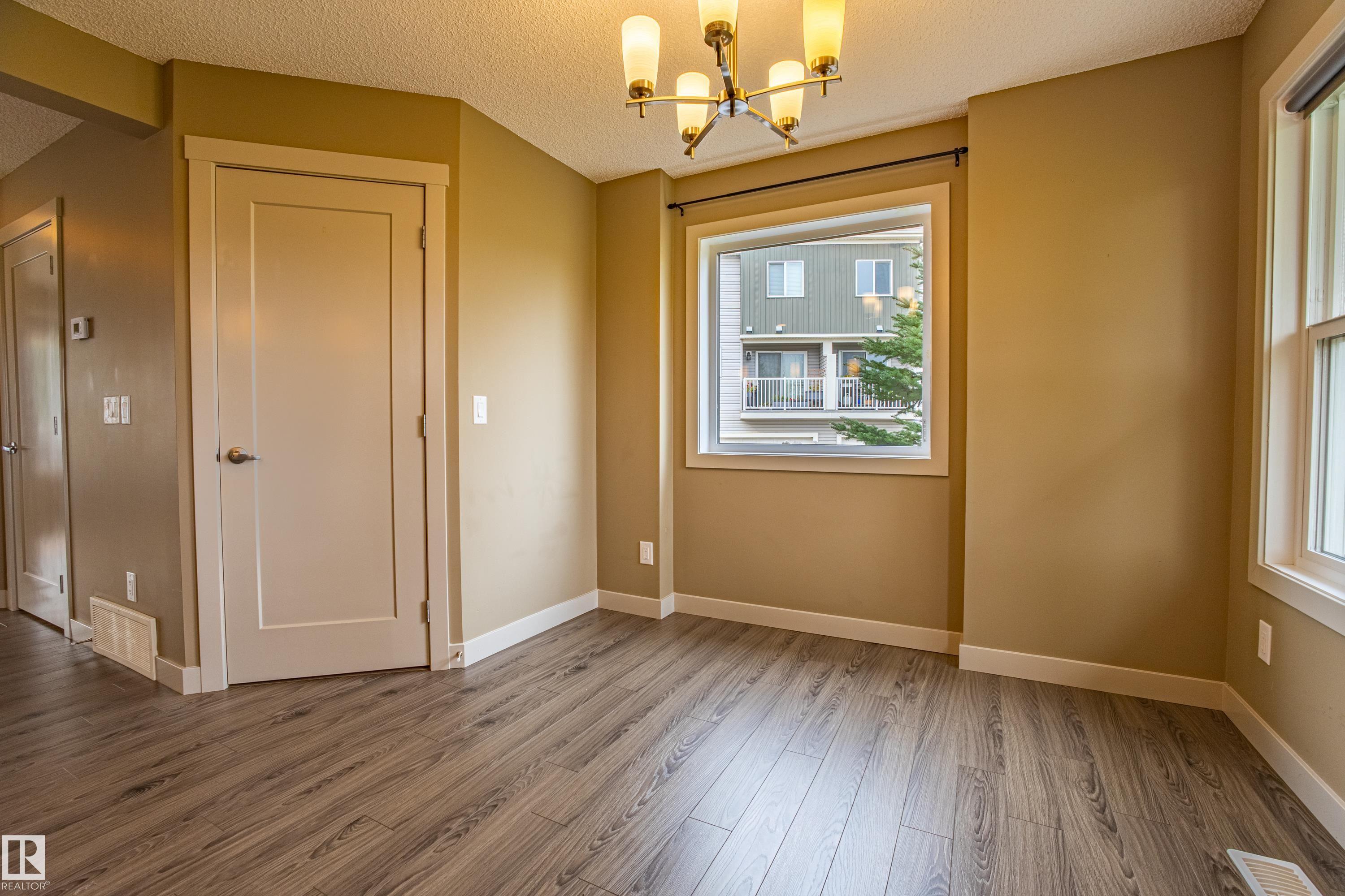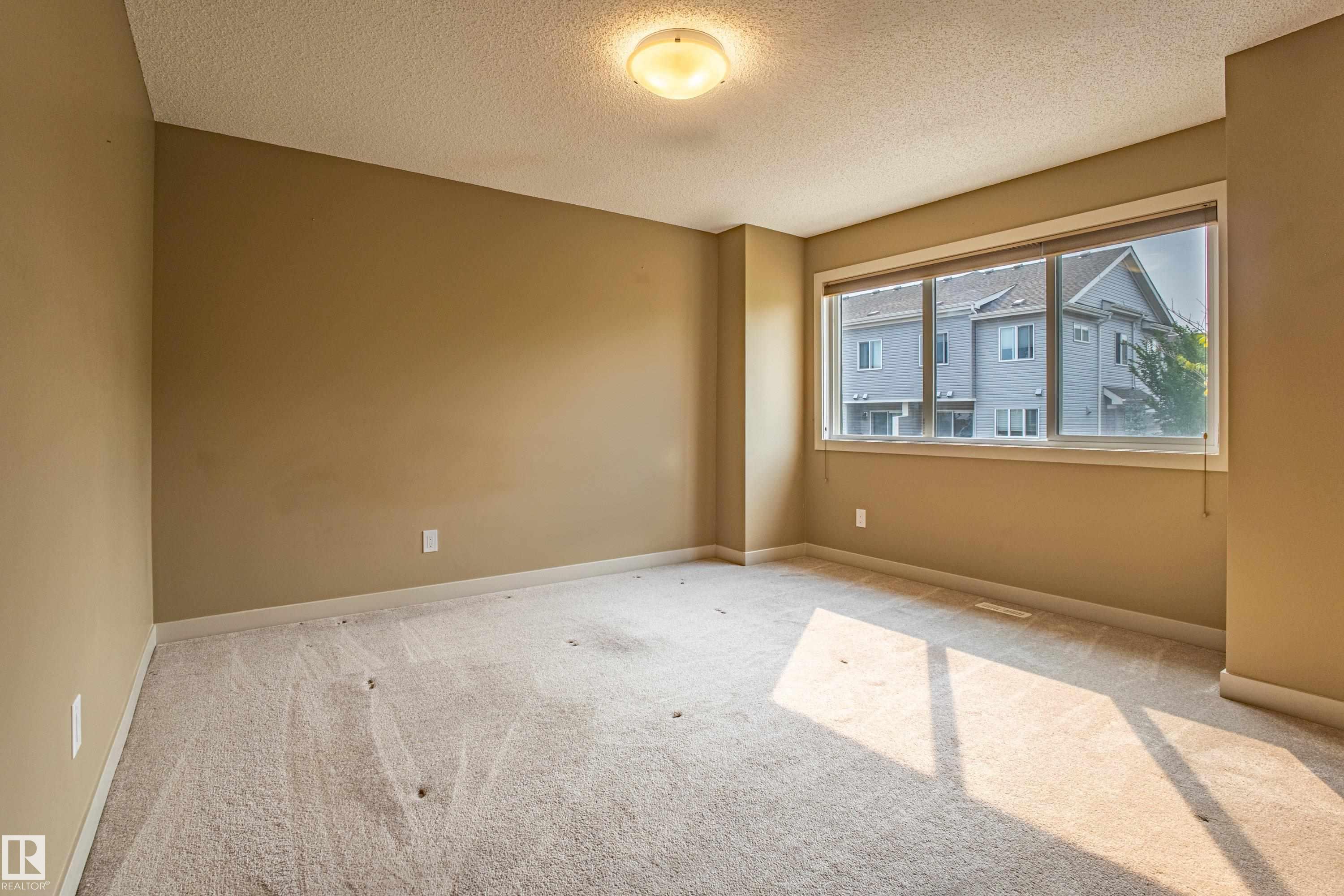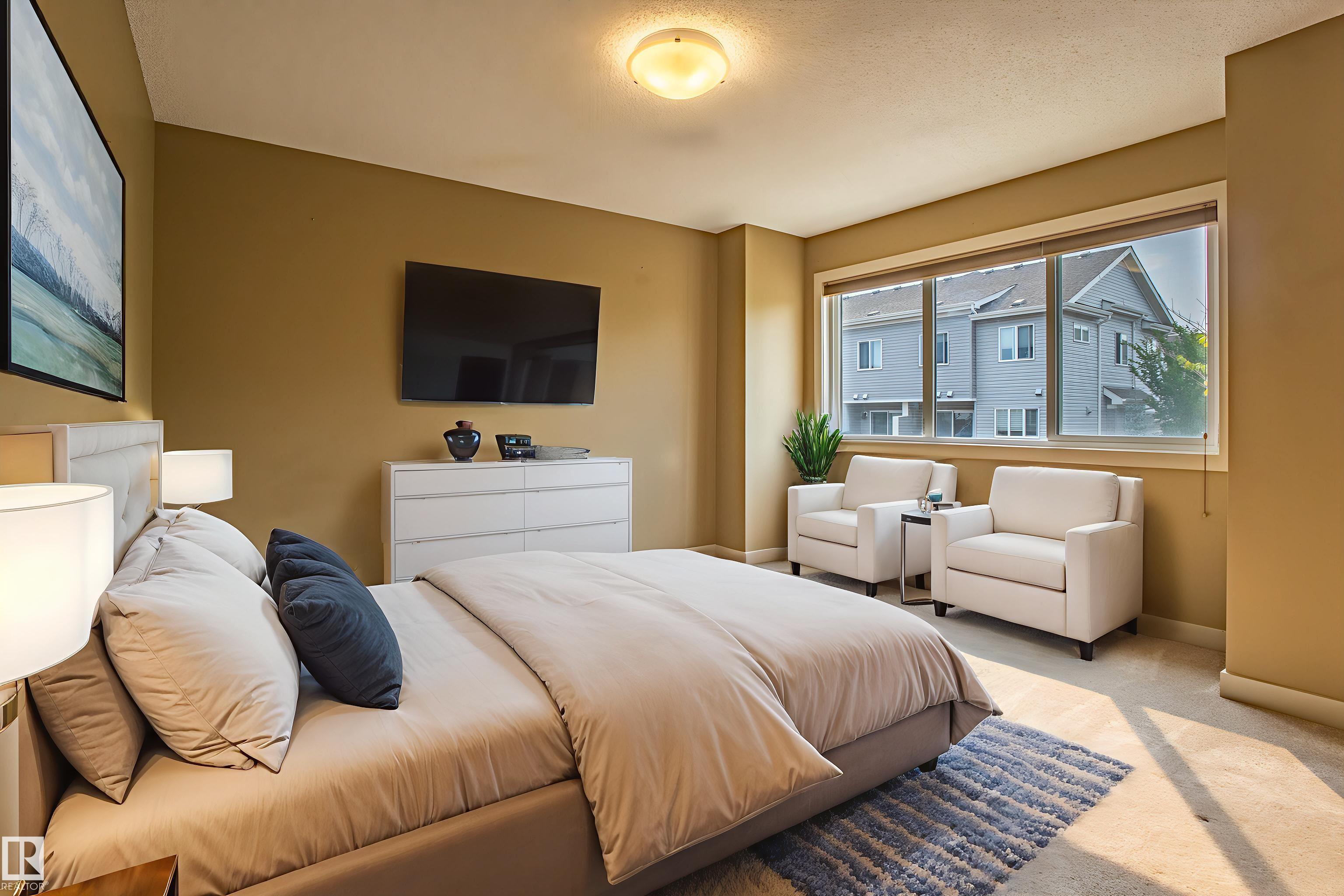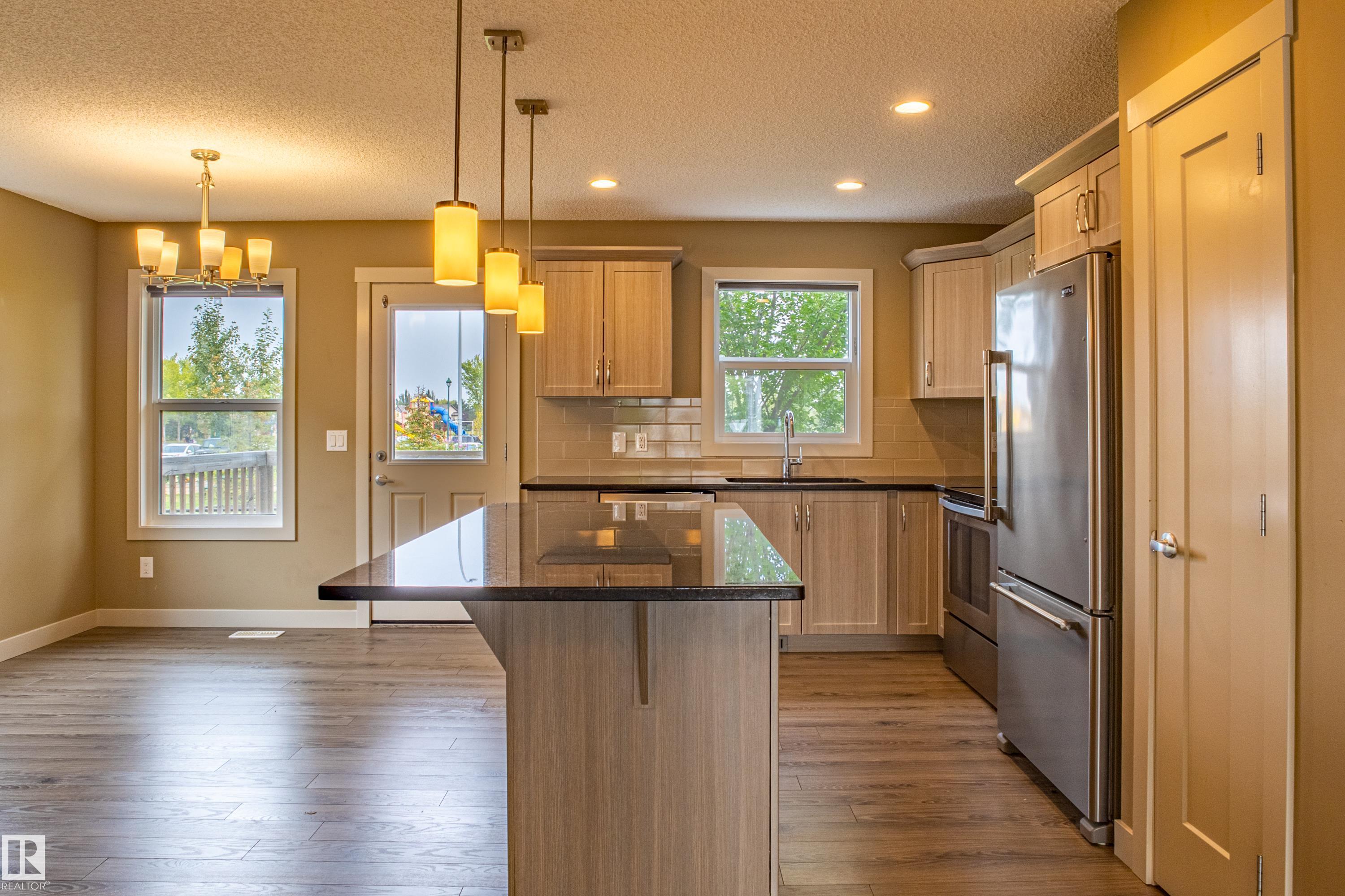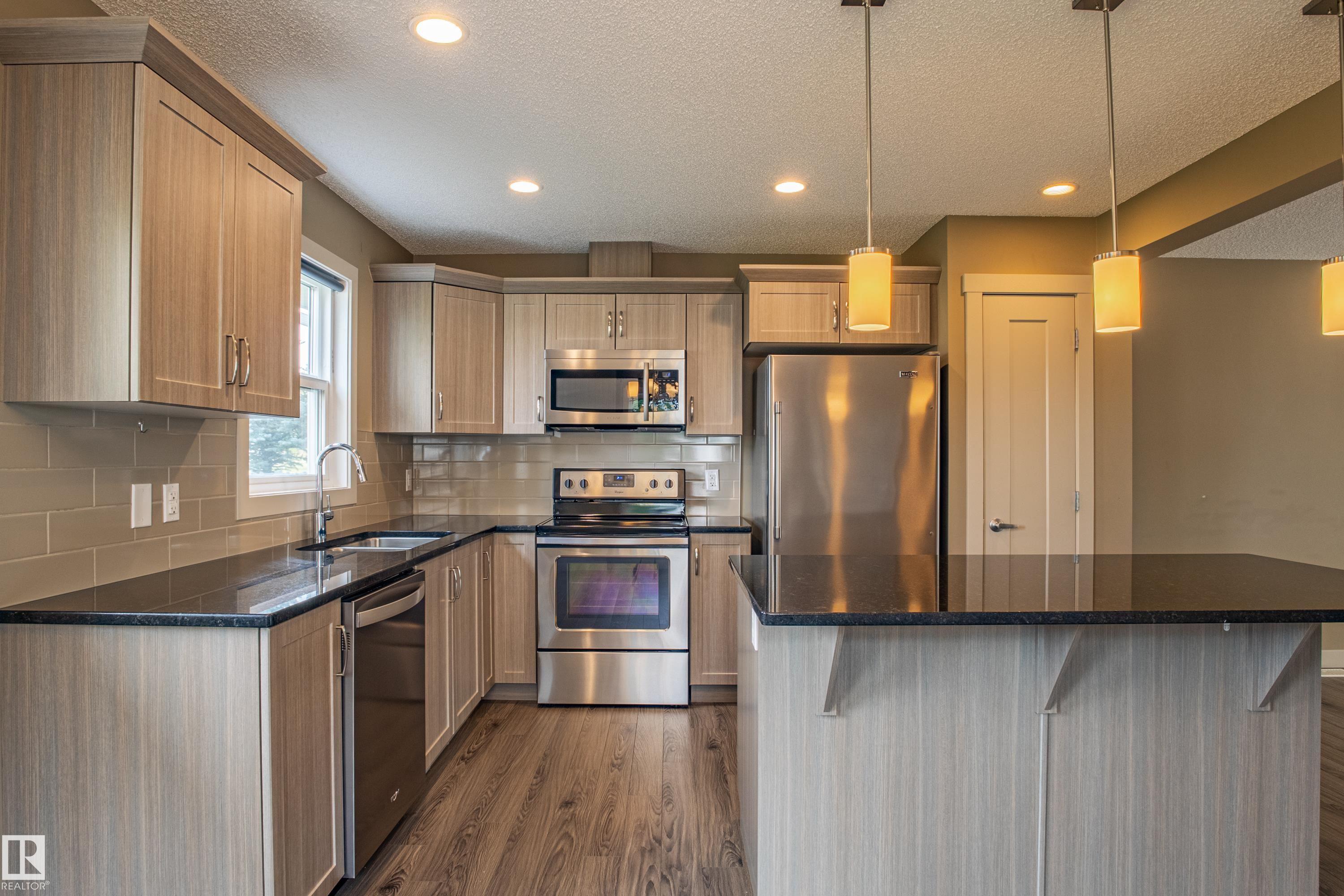 Welcome to Haddow Landing! This air-conditioned, bright south-facing 3-bedroom townhouse includes ***two titled parking stalls right in front of your door*** The two-storey layout is filled with natural light and features an unfinished basement ready for your customization. The main floor offers premium vinyl plank flooring, stainless steel appliances, ^black granite countertops^, and a half bath. Upstairs you'll find 3 bedrooms and a full bath, with the primary boasting a large walk-in closet. The unit is quietly tucked into the interior of the complex, away from traffic noise. Out back, enjoy a private deck with natural gas BBQ hookup overlooking Haddow Community Park with the Ridge Community Center, playground, hockey rink, and sports fields just a short walk away. Fantastic location only one minute to Terwillegar Drive, close to The Currents at Windermere, and transit is right outside the complex. This home is ready for you!