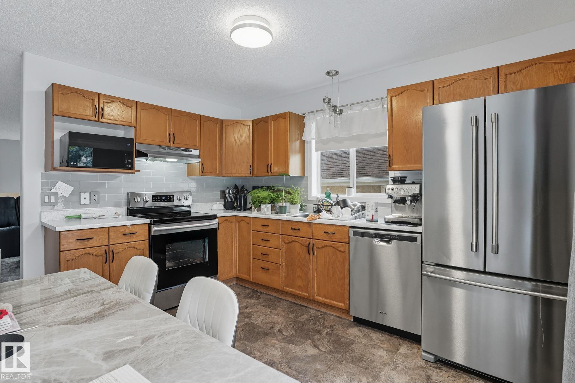 This upgraded 925 Sqft bi-level in River Point offers a bright and welcoming layout with abundant natural light. The main level features newer laminate flooring, an eat-in kitchen with stainless steel appliances, pantry, and ample cabinetry. Two comfortable bedrooms and an updated four-piece bathroom complete the upper floor. The finished basement includes a spacious family room with a gas fireplace, two additional bedrooms, a three-piece bathroom with a walk-in shower, and a combined laundry and storage area. The oversized garage is insulated, drywalled accommodating larger vehicles. Outdoor features include a fenced yard, a deck, and a newer storage shed. Central air conditioning and a high-efficiency furnace were installed in 2014.