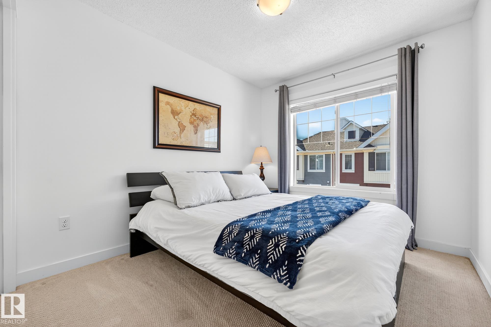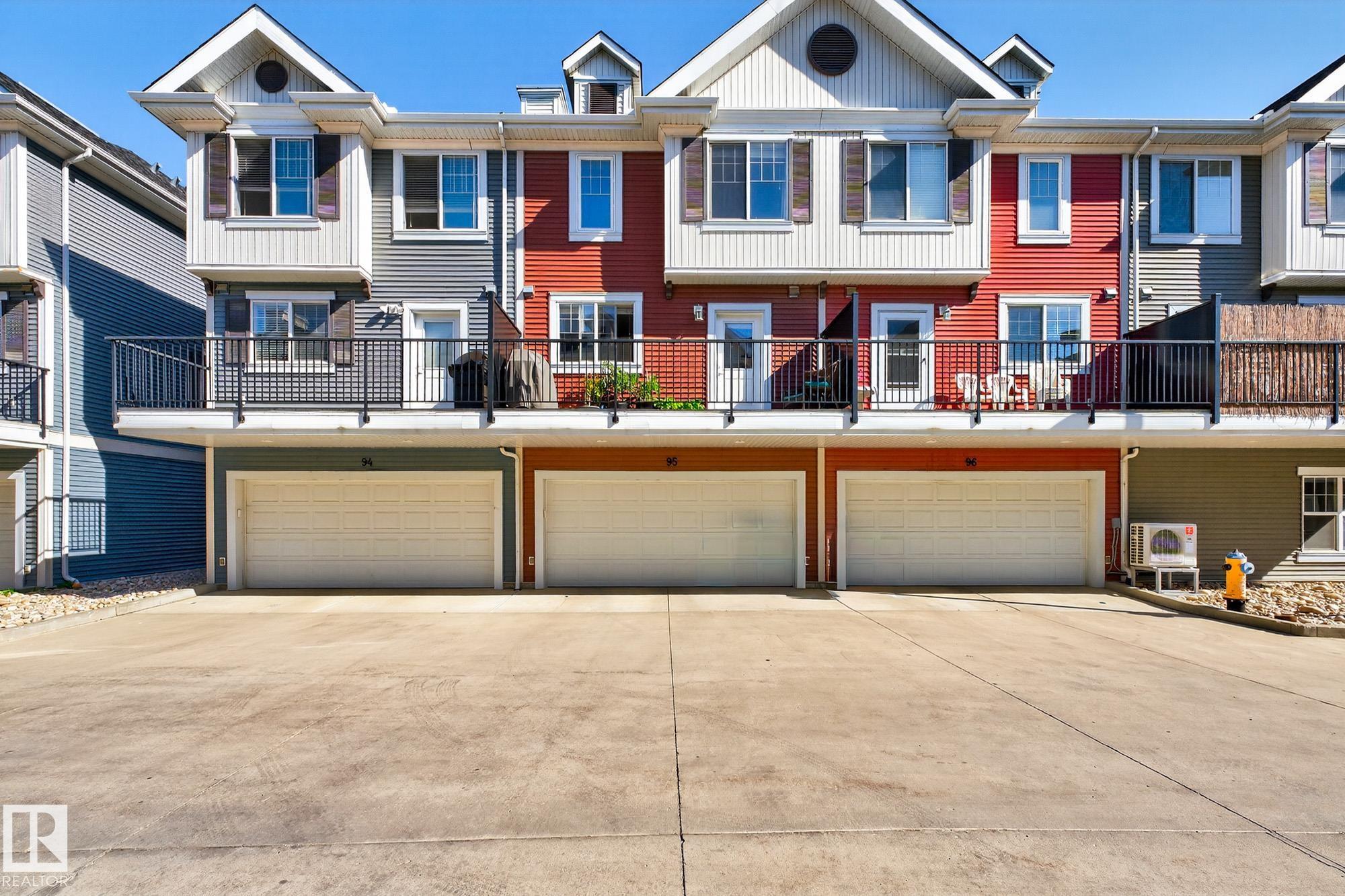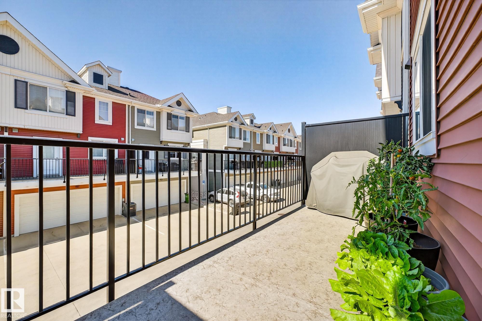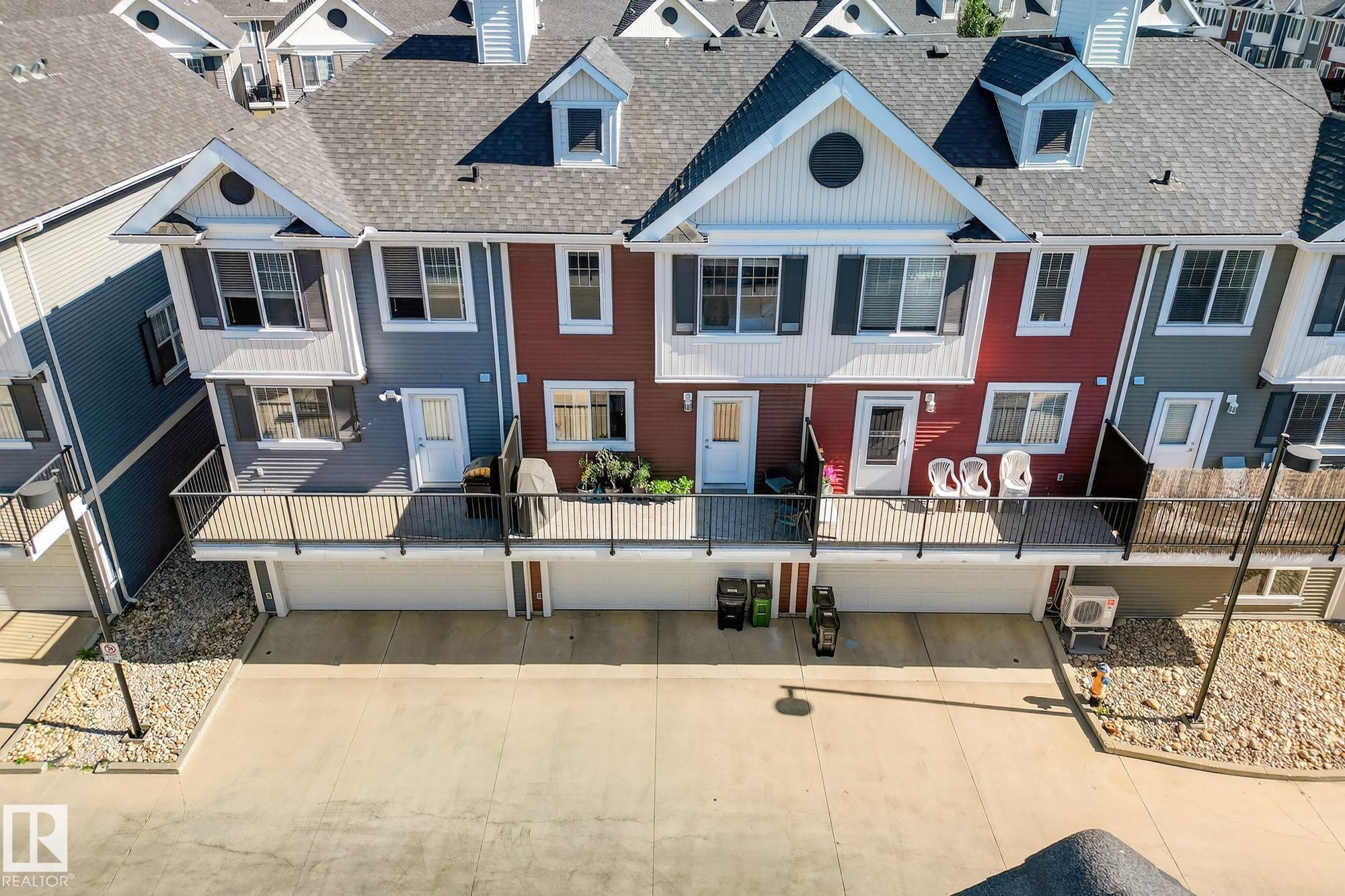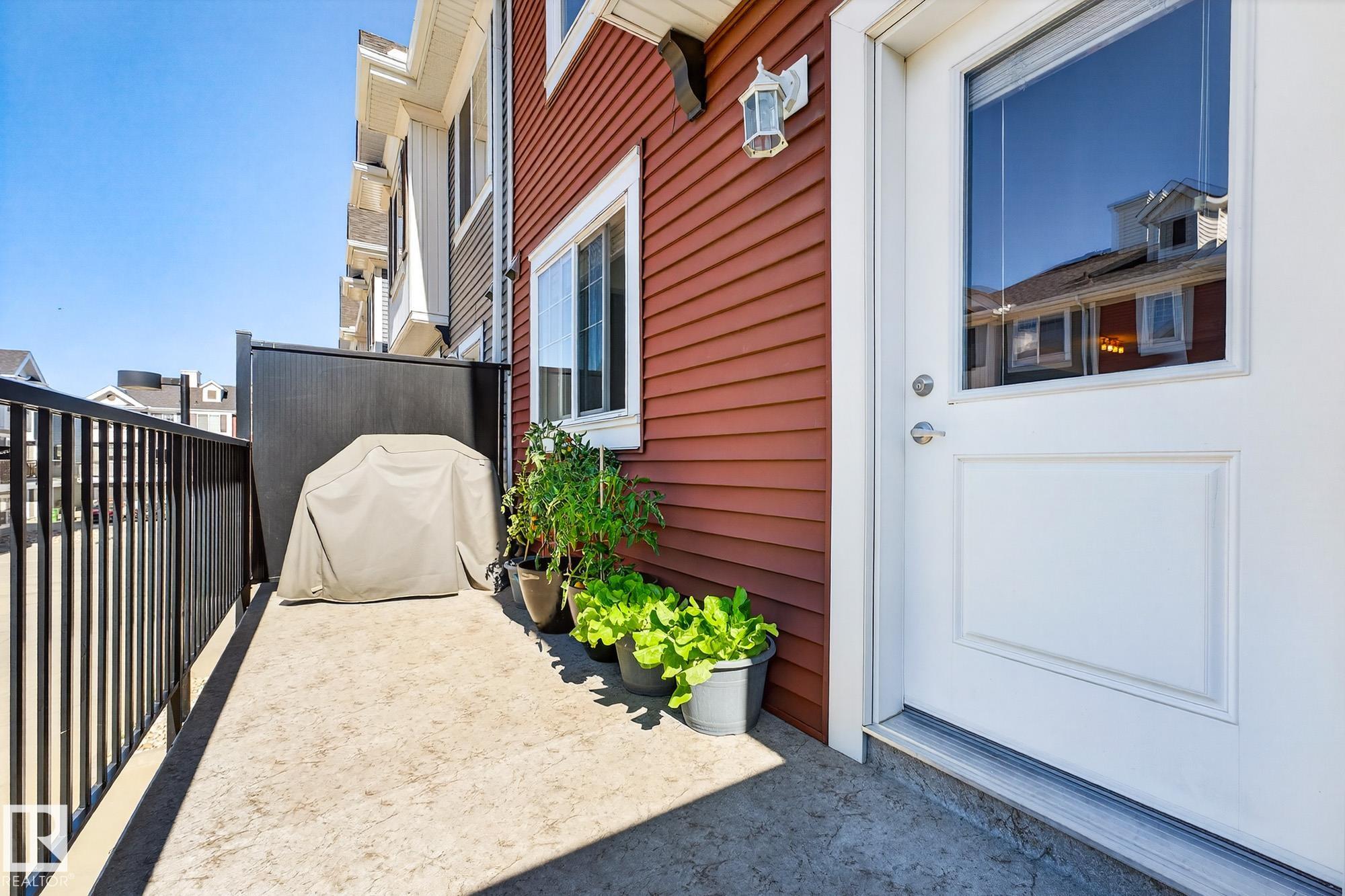 SELLER OPEN TO SHOWING WHILE PENDING. Freshly painted. 3 storey townhome w/DOUBLE attached garage overlooks green courtyard. 3 bed/2.5 baths. Top floor offers 3 beds, 4-pce bath & laundry (full-sized front load). Primary fits king bedroom set and has 3-pce ensuite plus 2 closets. Main floor is bright, with 9' ceilings, open-concept layout. Gourmet kitchen with quartz counters, soft-close drawers, pantry, stainless steel appliances, island with breakfast bar. Large dining & living room. Private balcony, complete with BBQ gas hookup. Entry level includes bonus area perfect for office, playroom, or gym, and opens to quiet greenspace ideal for kids or pets. Double attached garage is fully finished (drywall, vapour barrier, insulation to keep warm). Tons of visitor parking + ample extra parking on street. Furnace filter replaced regularly. Close to Anthony Henday, CFB Edmonton, schools, parks & shopping. Dog friendly: 2 allowed. 1543 Sq Ft Taxes $2950 for 2025. Possession negotiable, quick possession avail.
