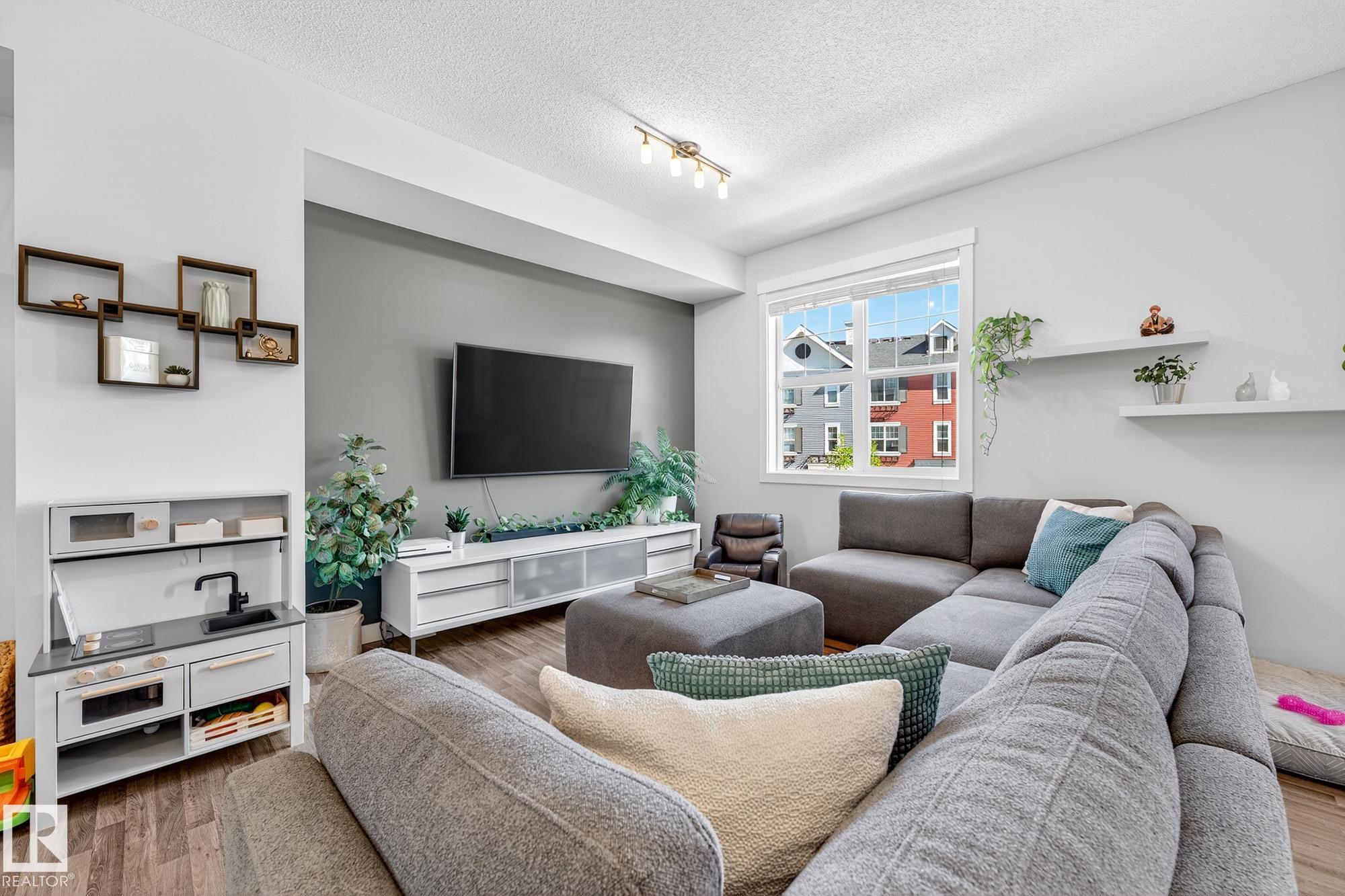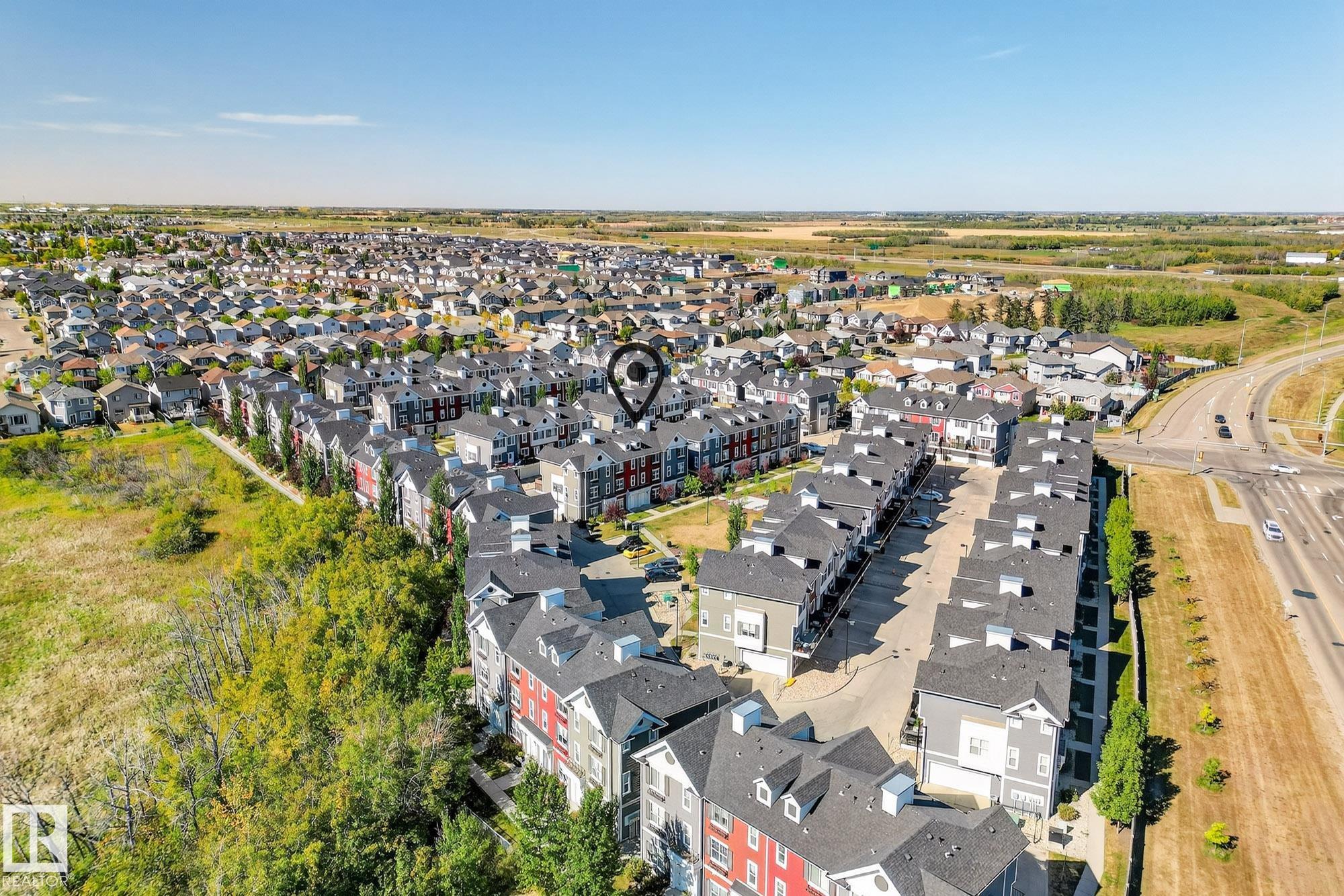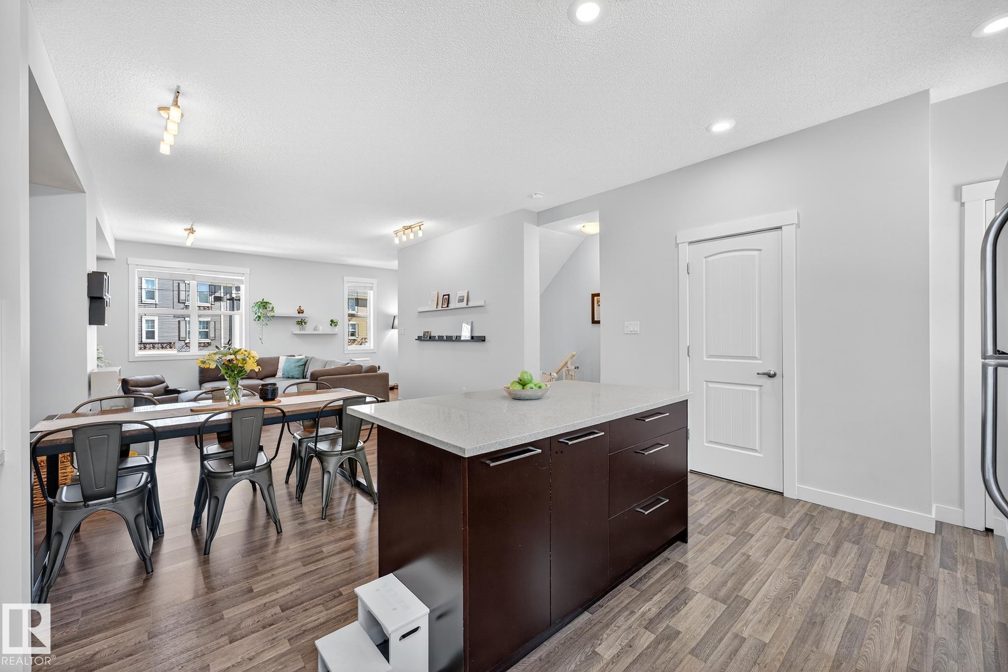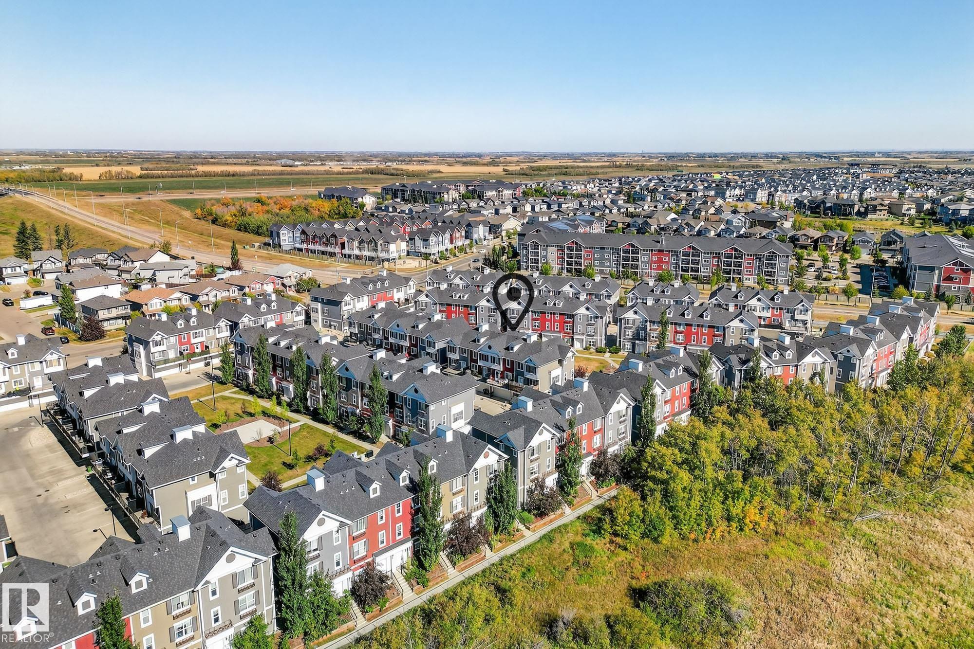 SELLER OPEN TO SHOWING WHILE PENDING. Freshly painted. 3 storey townhome w/DOUBLE attached garage overlooks green courtyard. 3 bed/2.5 baths. Top floor offers 3 beds, 4-pce bath & laundry (full-sized front load). Primary fits king bedroom set and has 3-pce ensuite plus 2 closets. Main floor is bright, with 9' ceilings, open-concept layout. Gourmet kitchen with quartz counters, soft-close drawers, pantry, stainless steel appliances, island with breakfast bar. Large dining & living room. Private balcony, complete with BBQ gas hookup. Entry level includes bonus area perfect for office, playroom, or gym, and opens to quiet greenspace ideal for kids or pets. Double attached garage is fully finished (drywall, vapour barrier, insulation to keep warm). Tons of visitor parking + ample extra parking on street. Furnace filter replaced regularly. Close to Anthony Henday, CFB Edmonton, schools, parks & shopping. Dog friendly: 2 allowed. 1543 Sq Ft Taxes $2950 for 2025. Possession negotiable, quick possession avail.