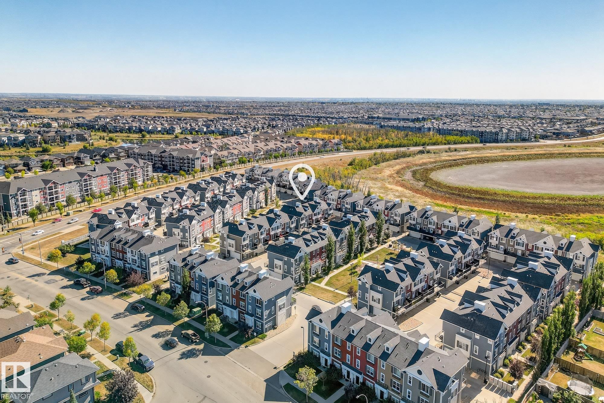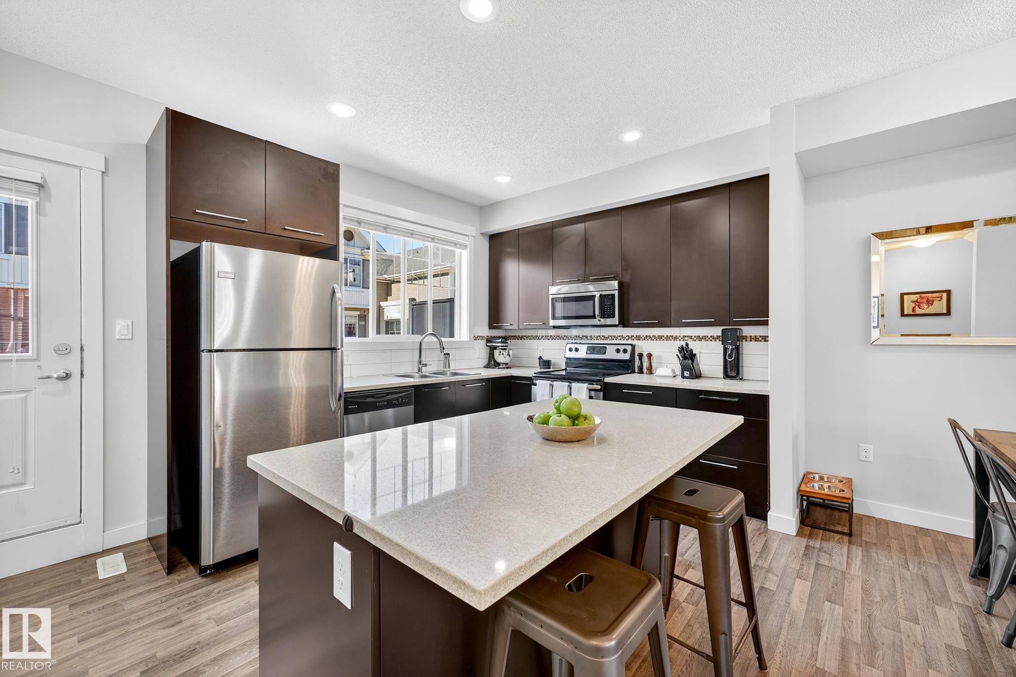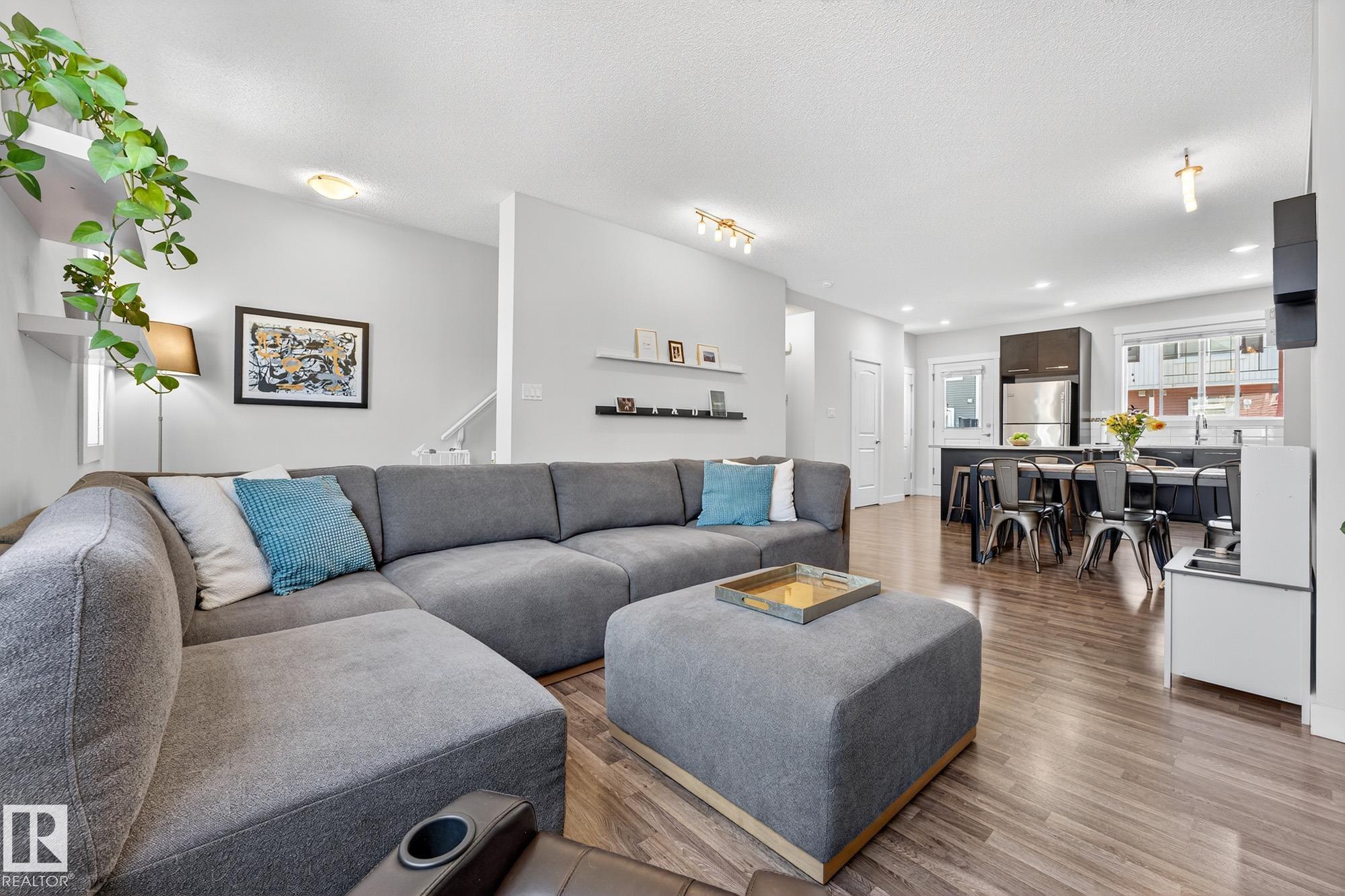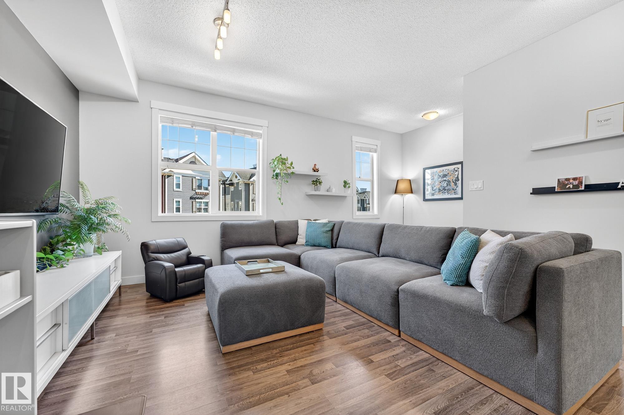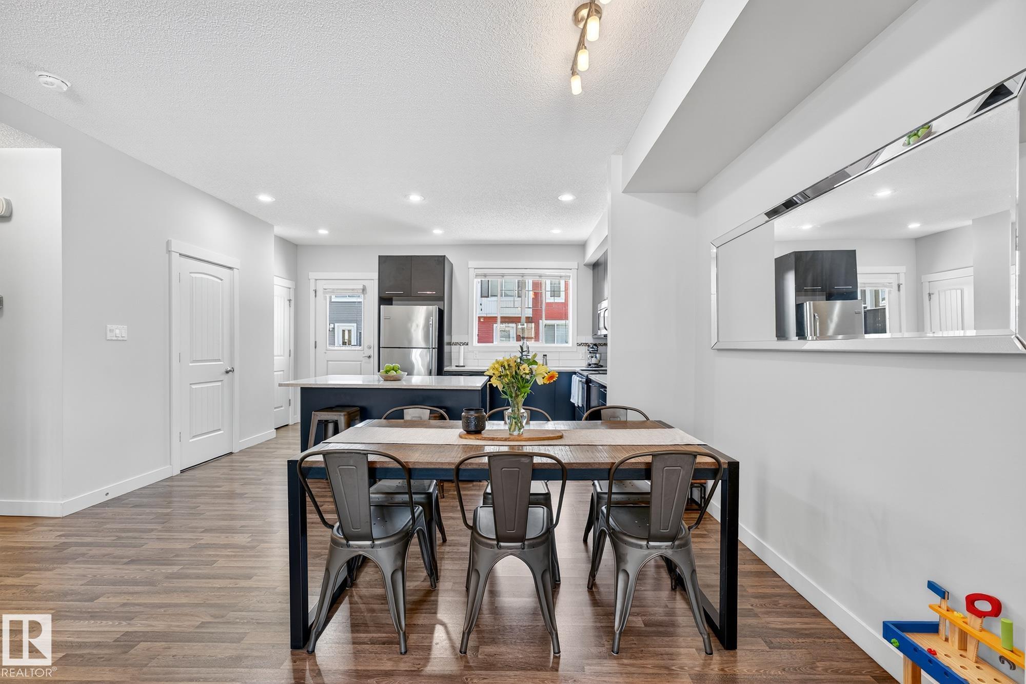 SELLER OPEN TO SHOWING WHILE PENDING. Freshly painted. 3 storey townhome w/DOUBLE attached garage overlooks green courtyard. 3 bed/2.5 baths. Top floor offers 3 beds, 4-pce bath & laundry (full-sized front load). Primary fits king bedroom set and has 3-pce ensuite plus 2 closets. Main floor is bright, with 9' ceilings, open-concept layout. Gourmet kitchen with quartz counters, soft-close drawers, pantry, stainless steel appliances, island with breakfast bar. Large dining & living room. Private balcony, complete with BBQ gas hookup. Entry level includes bonus area perfect for office, playroom, or gym, and opens to quiet greenspace ideal for kids or pets. Double attached garage is fully finished (drywall, vapour barrier, insulation to keep warm). Tons of visitor parking + ample extra parking on street. Furnace filter replaced regularly. Close to Anthony Henday, CFB Edmonton, schools, parks & shopping. Dog friendly: 2 allowed. 1543 Sq Ft Taxes $2950 for 2025. Possession negotiable, quick possession avail.