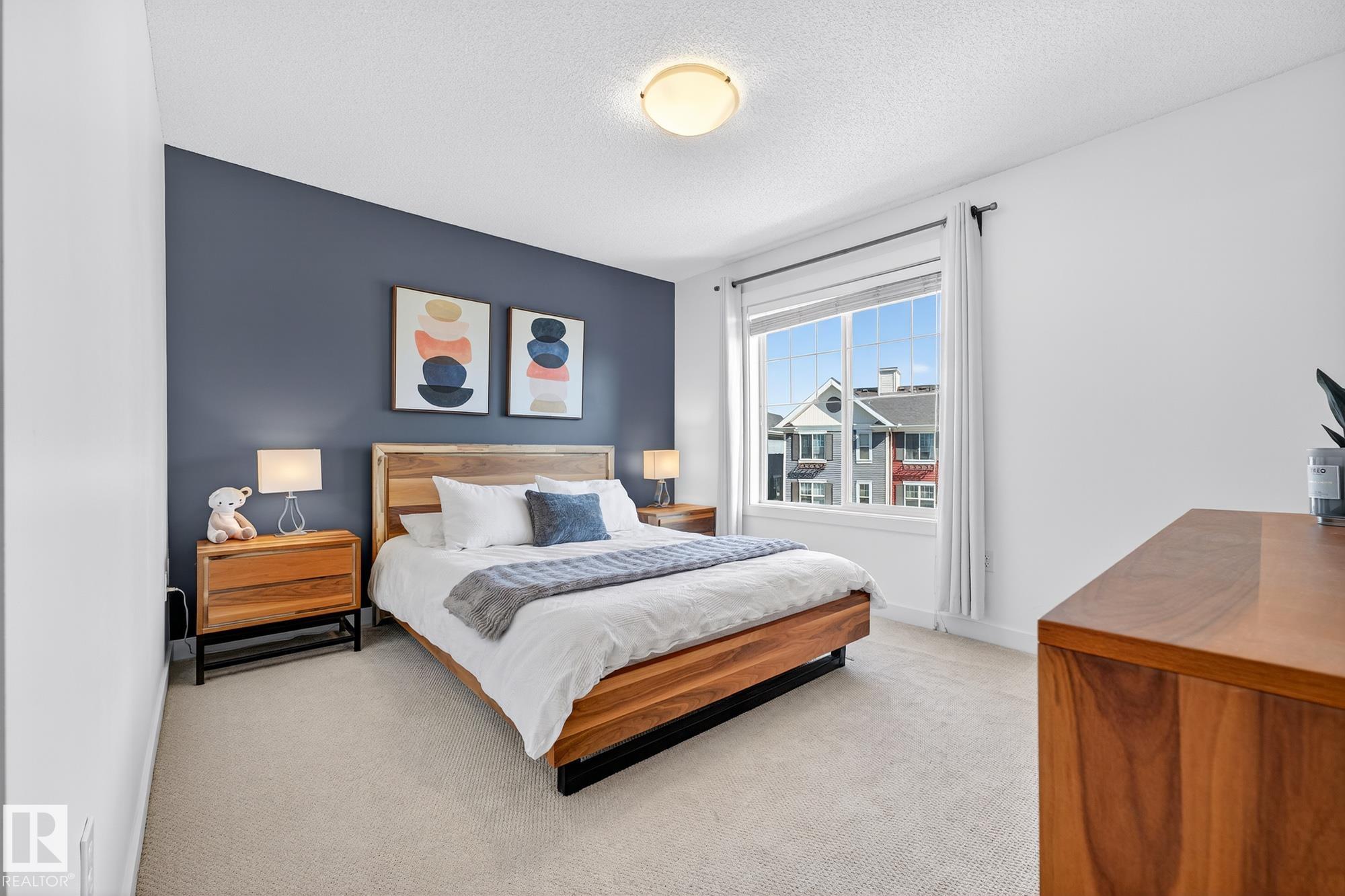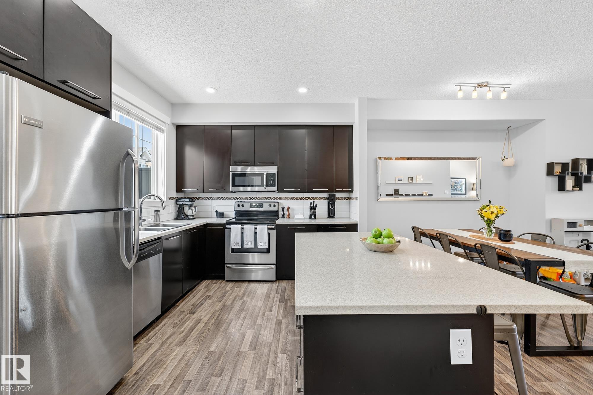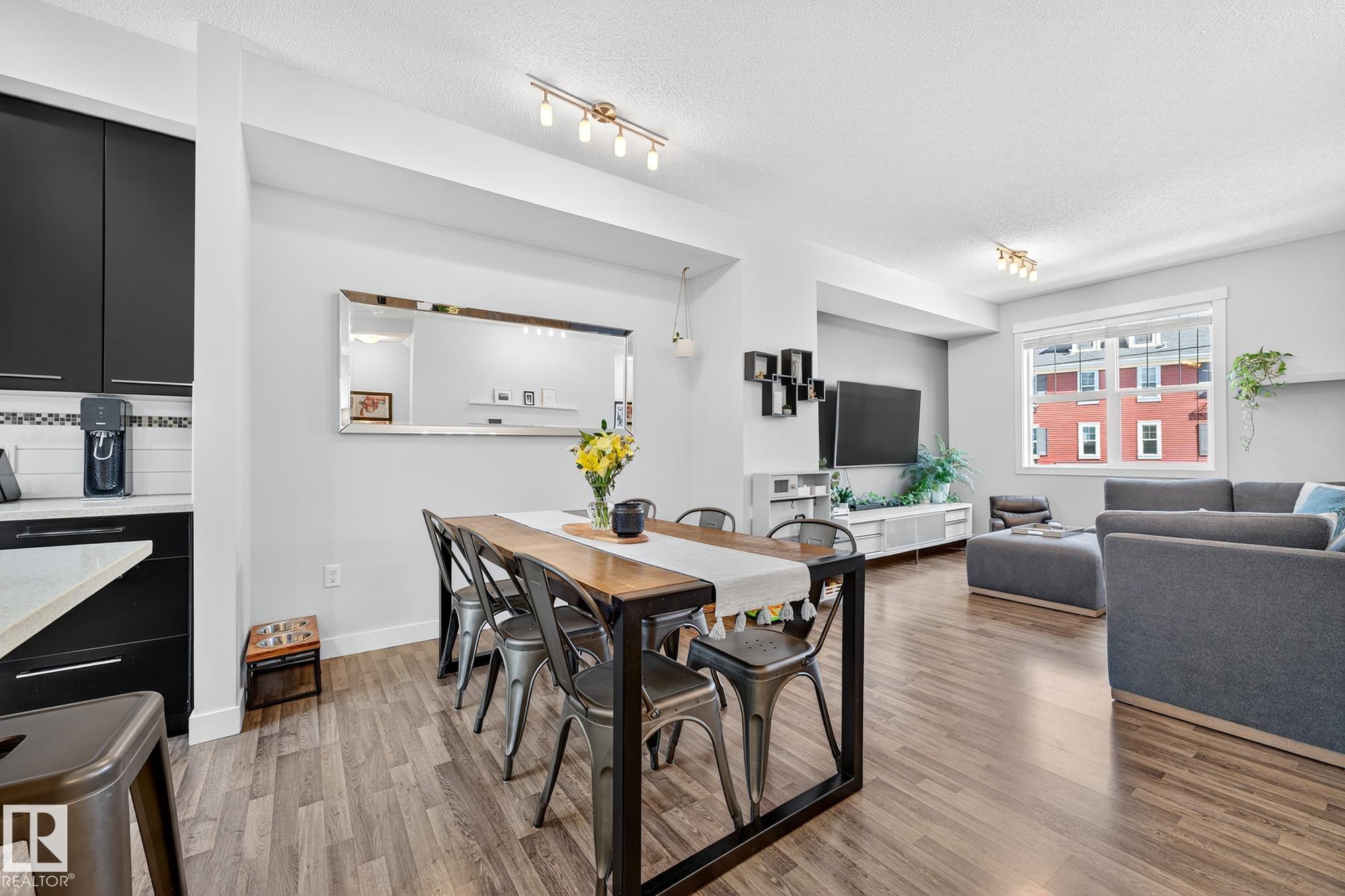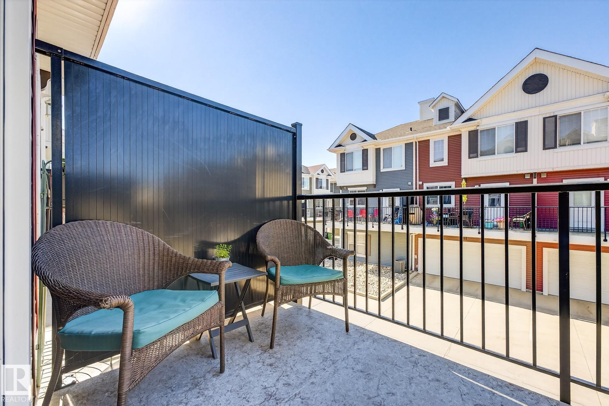 SELLER OPEN TO SHOWING WHILE PENDING. Freshly painted. 3 storey townhome w/DOUBLE attached garage overlooks green courtyard. 3 bed/2.5 baths. Top floor offers 3 beds, 4-pce bath & laundry (full-sized front load). Primary fits king bedroom set and has 3-pce ensuite plus 2 closets. Main floor is bright, with 9' ceilings, open-concept layout. Gourmet kitchen with quartz counters, soft-close drawers, pantry, stainless steel appliances, island with breakfast bar. Large dining & living room. Private balcony, complete with BBQ gas hookup. Entry level includes bonus area perfect for office, playroom, or gym, and opens to quiet greenspace ideal for kids or pets. Double attached garage is fully finished (drywall, vapour barrier, insulation to keep warm). Tons of visitor parking + ample extra parking on street. Furnace filter replaced regularly. Close to Anthony Henday, CFB Edmonton, schools, parks & shopping. Dog friendly: 2 allowed. 1543 Sq Ft Taxes $2950 for 2025. Possession negotiable, quick possession avail.
