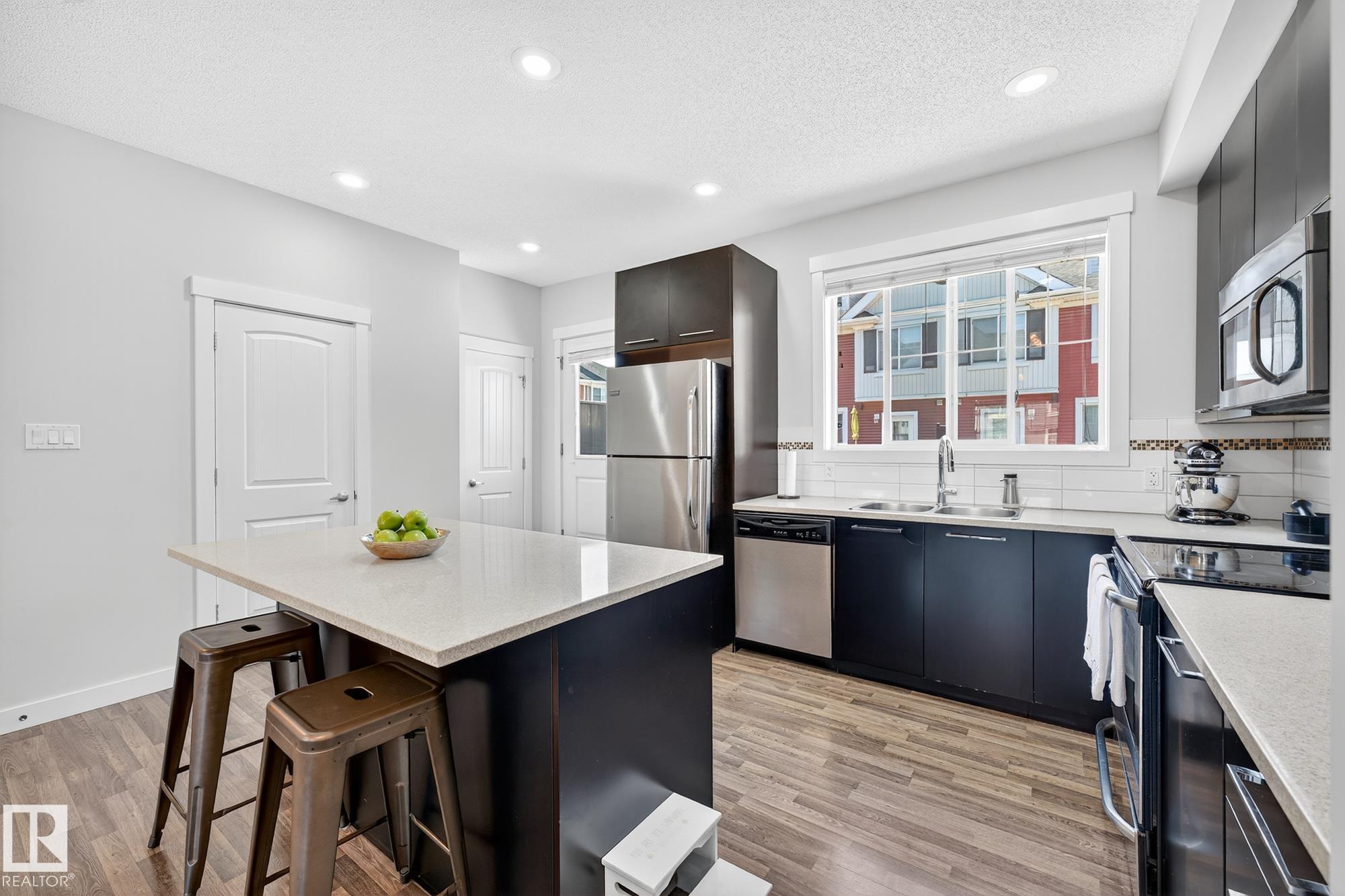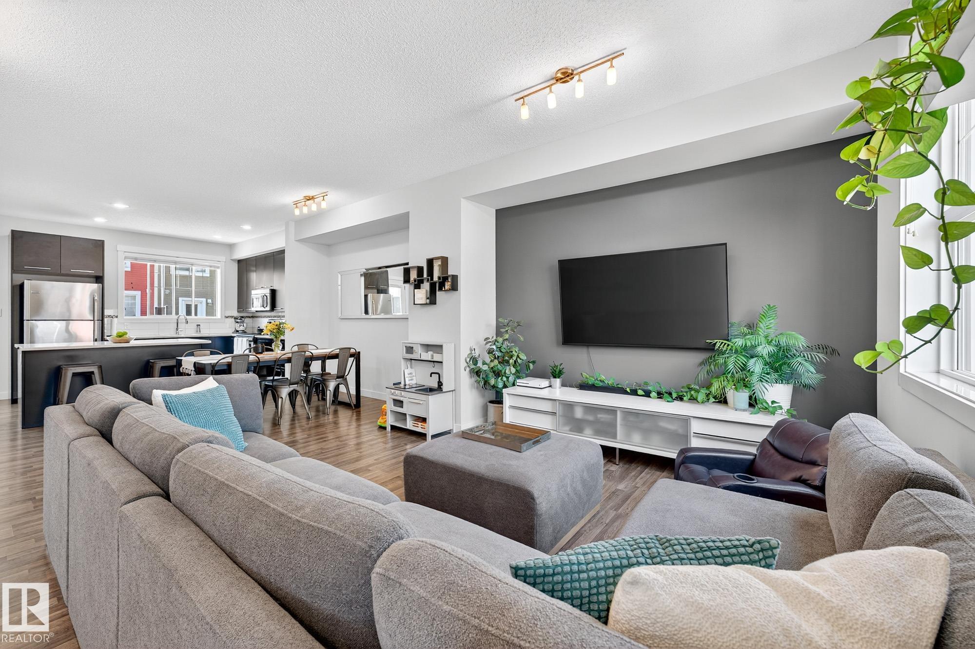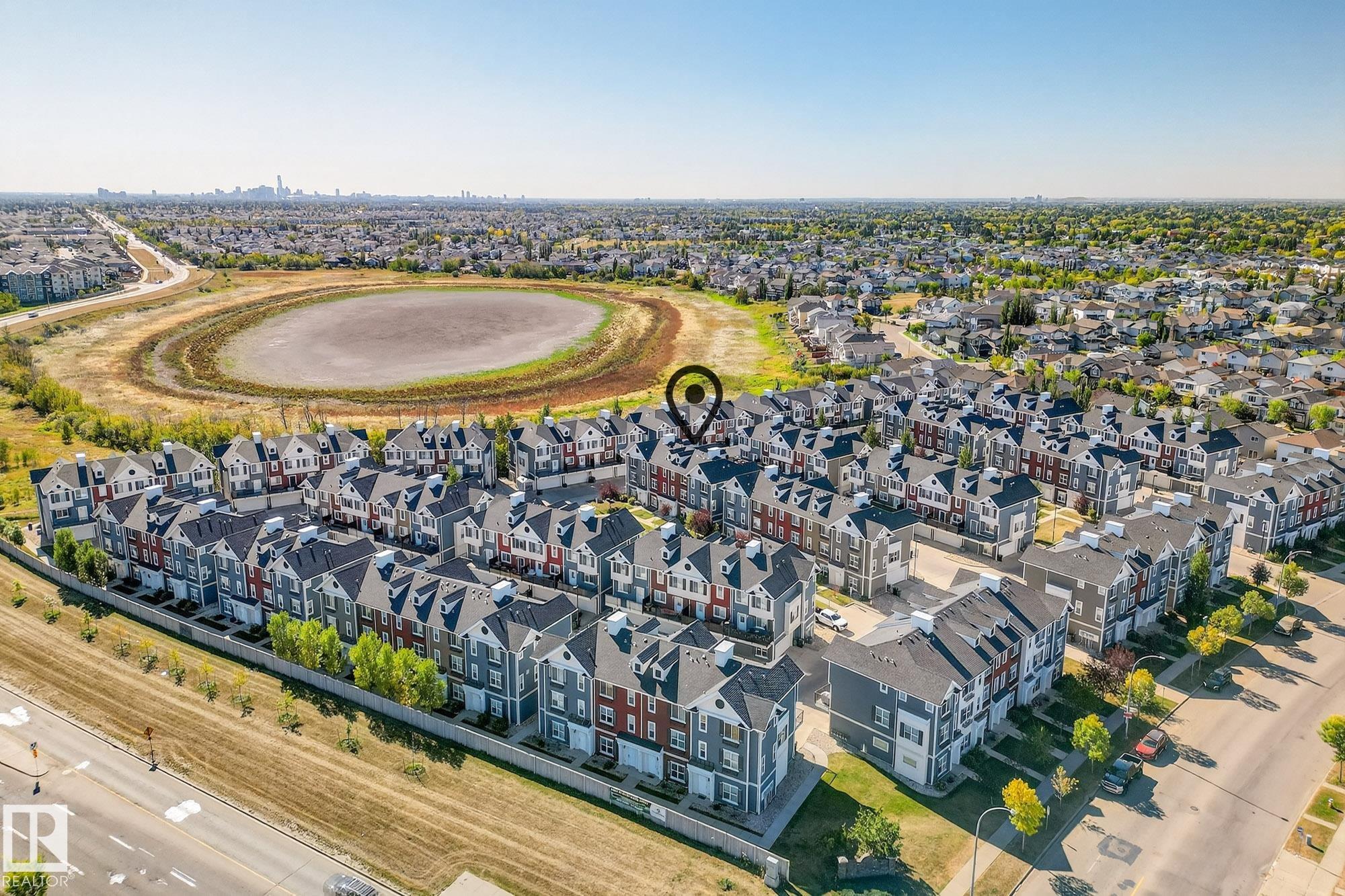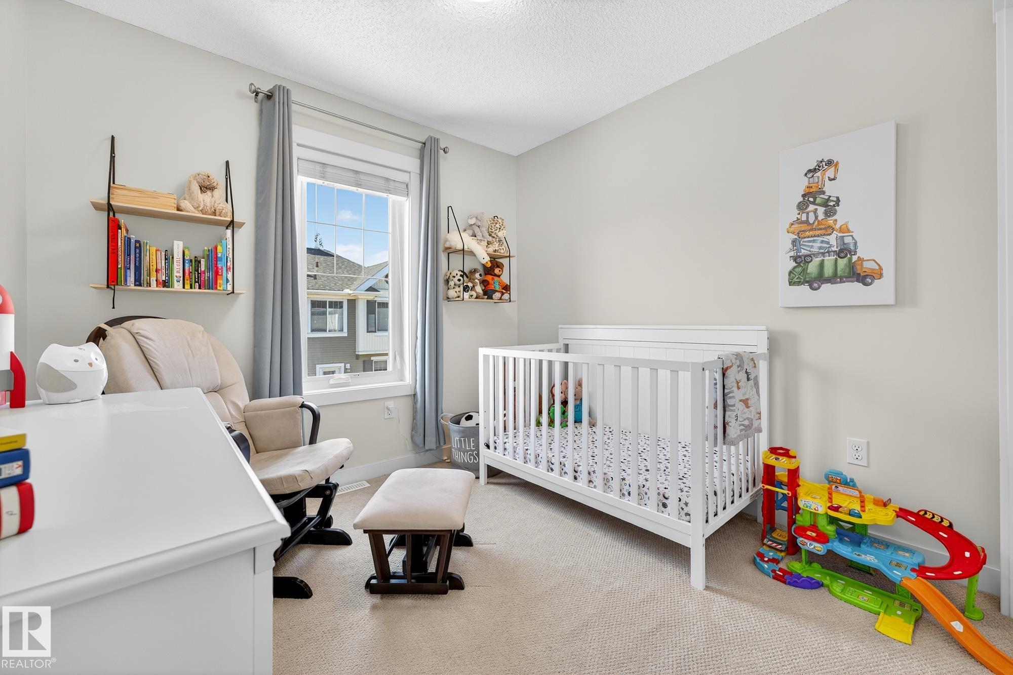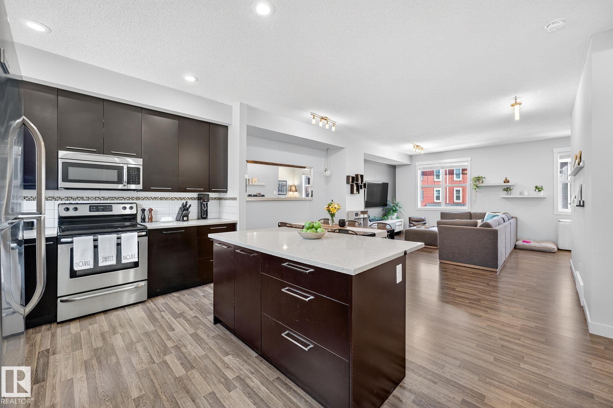 SELLER OPEN TO SHOWING WHILE PENDING. Freshly painted. 3 storey townhome w/DOUBLE attached garage overlooks green courtyard. 3 bed/2.5 baths. Top floor offers 3 beds, 4-pce bath & laundry (full-sized front load). Primary fits king bedroom set and has 3-pce ensuite plus 2 closets. Main floor is bright, with 9' ceilings, open-concept layout. Gourmet kitchen with quartz counters, soft-close drawers, pantry, stainless steel appliances, island with breakfast bar. Large dining & living room. Private balcony, complete with BBQ gas hookup. Entry level includes bonus area perfect for office, playroom, or gym, and opens to quiet greenspace ideal for kids or pets. Double attached garage is fully finished (drywall, vapour barrier, insulation to keep warm). Tons of visitor parking + ample extra parking on street. Furnace filter replaced regularly. Close to Anthony Henday, CFB Edmonton, schools, parks & shopping. Dog friendly: 2 allowed. 1543 Sq Ft Taxes $2950 for 2025. Possession negotiable, quick possession avail.