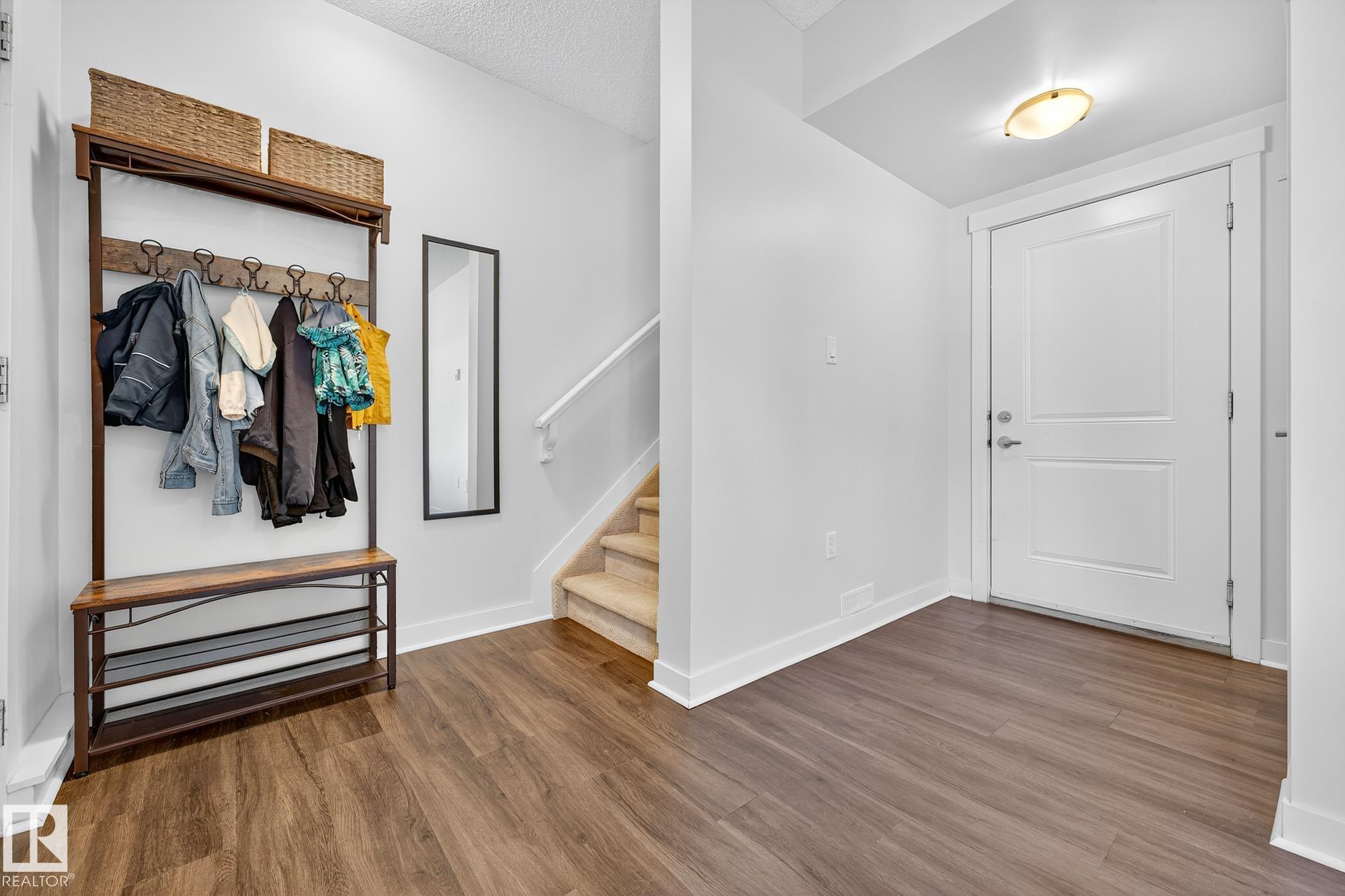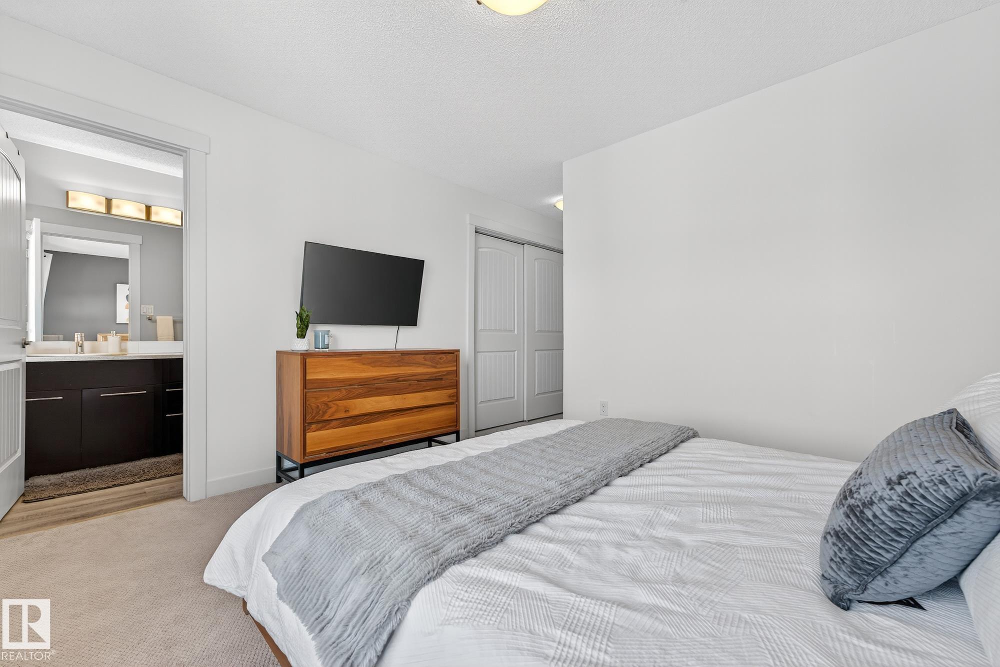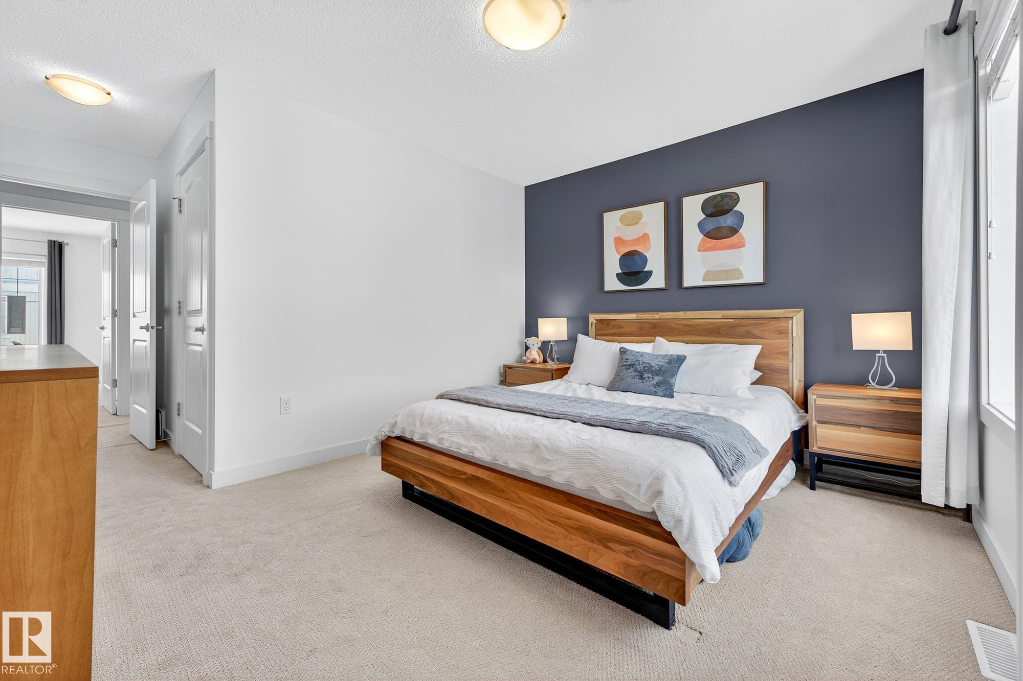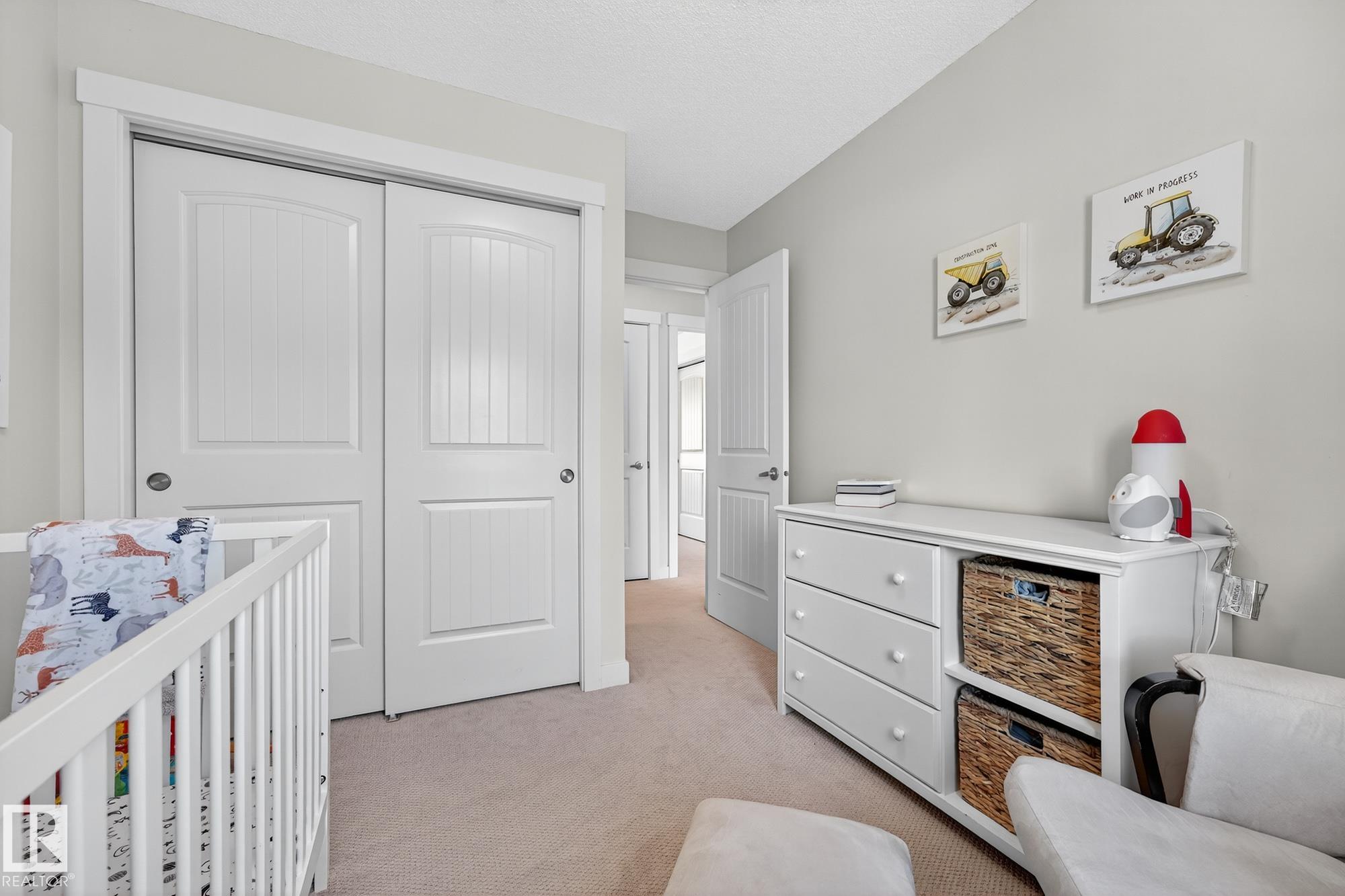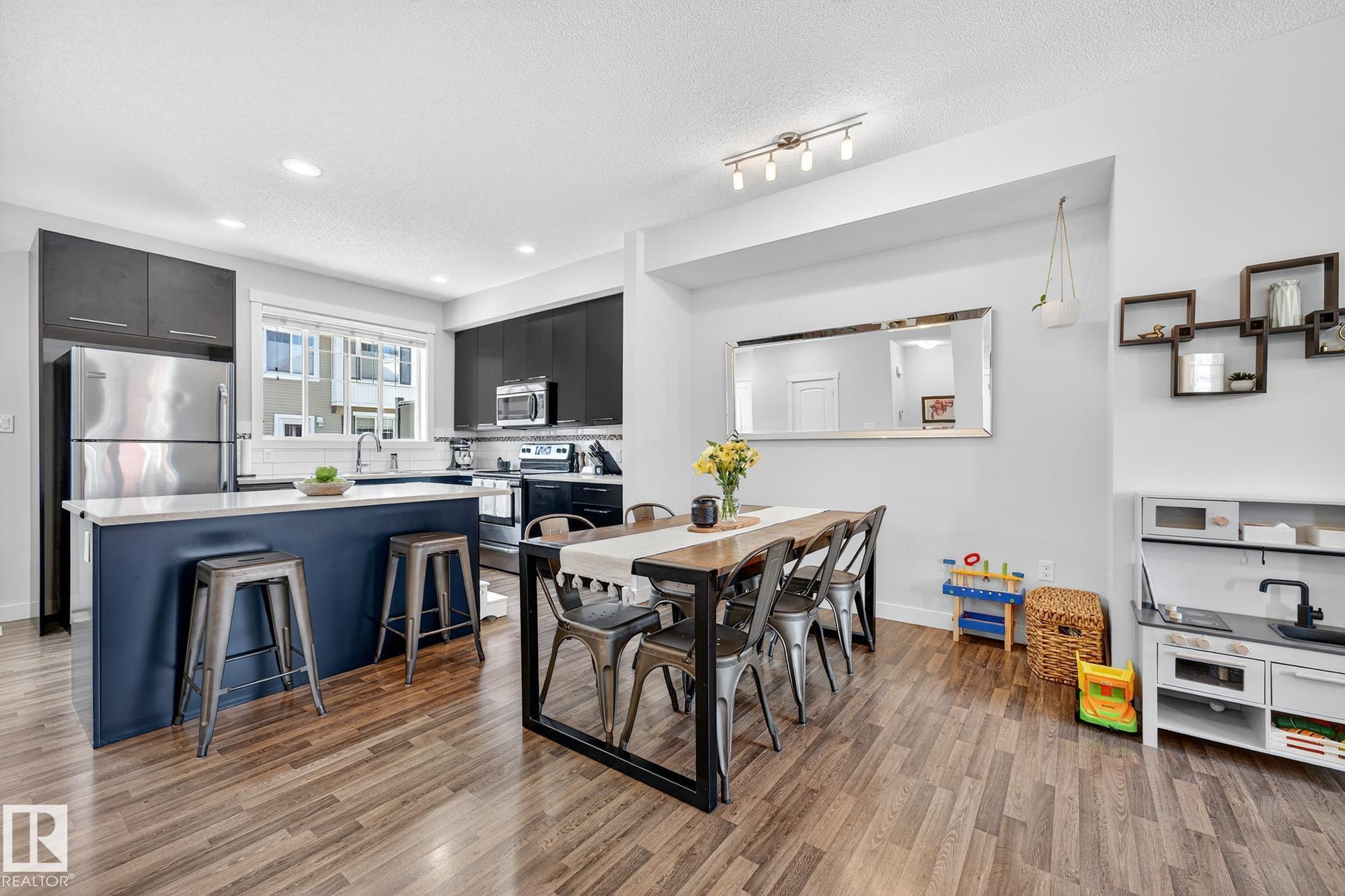 SELLER OPEN TO SHOWING WHILE PENDING. Freshly painted. 3 storey townhome w/DOUBLE attached garage overlooks green courtyard. 3 bed/2.5 baths. Top floor offers 3 beds, 4-pce bath & laundry (full-sized front load). Primary fits king bedroom set and has 3-pce ensuite plus 2 closets. Main floor is bright, with 9' ceilings, open-concept layout. Gourmet kitchen with quartz counters, soft-close drawers, pantry, stainless steel appliances, island with breakfast bar. Large dining & living room. Private balcony, complete with BBQ gas hookup. Entry level includes bonus area perfect for office, playroom, or gym, and opens to quiet greenspace ideal for kids or pets. Double attached garage is fully finished (drywall, vapour barrier, insulation to keep warm). Tons of visitor parking + ample extra parking on street. Furnace filter replaced regularly. Close to Anthony Henday, CFB Edmonton, schools, parks & shopping. Dog friendly: 2 allowed. 1543 Sq Ft Taxes $2950 for 2025. Possession negotiable, quick possession avail.