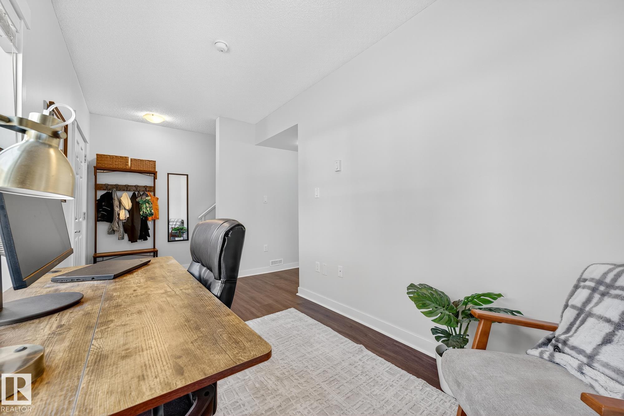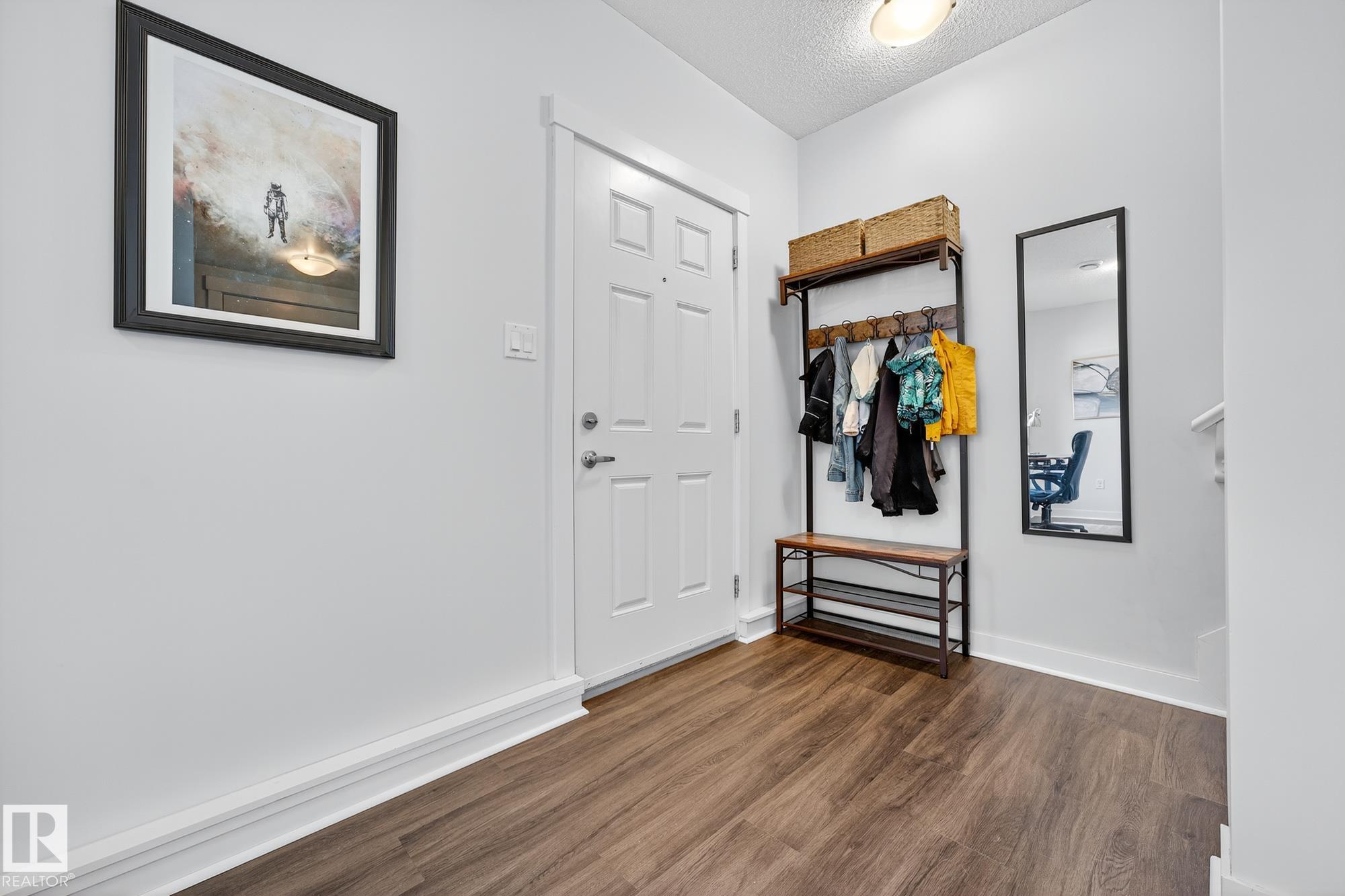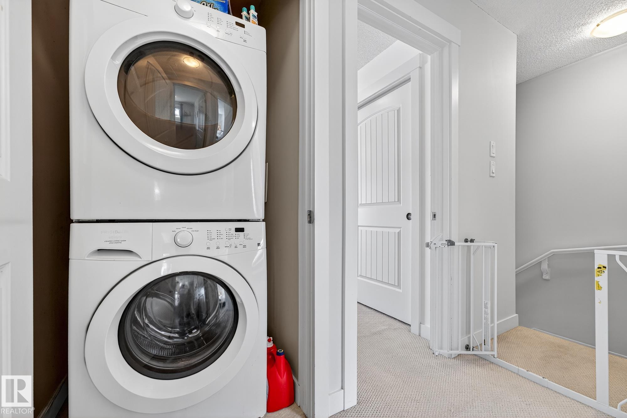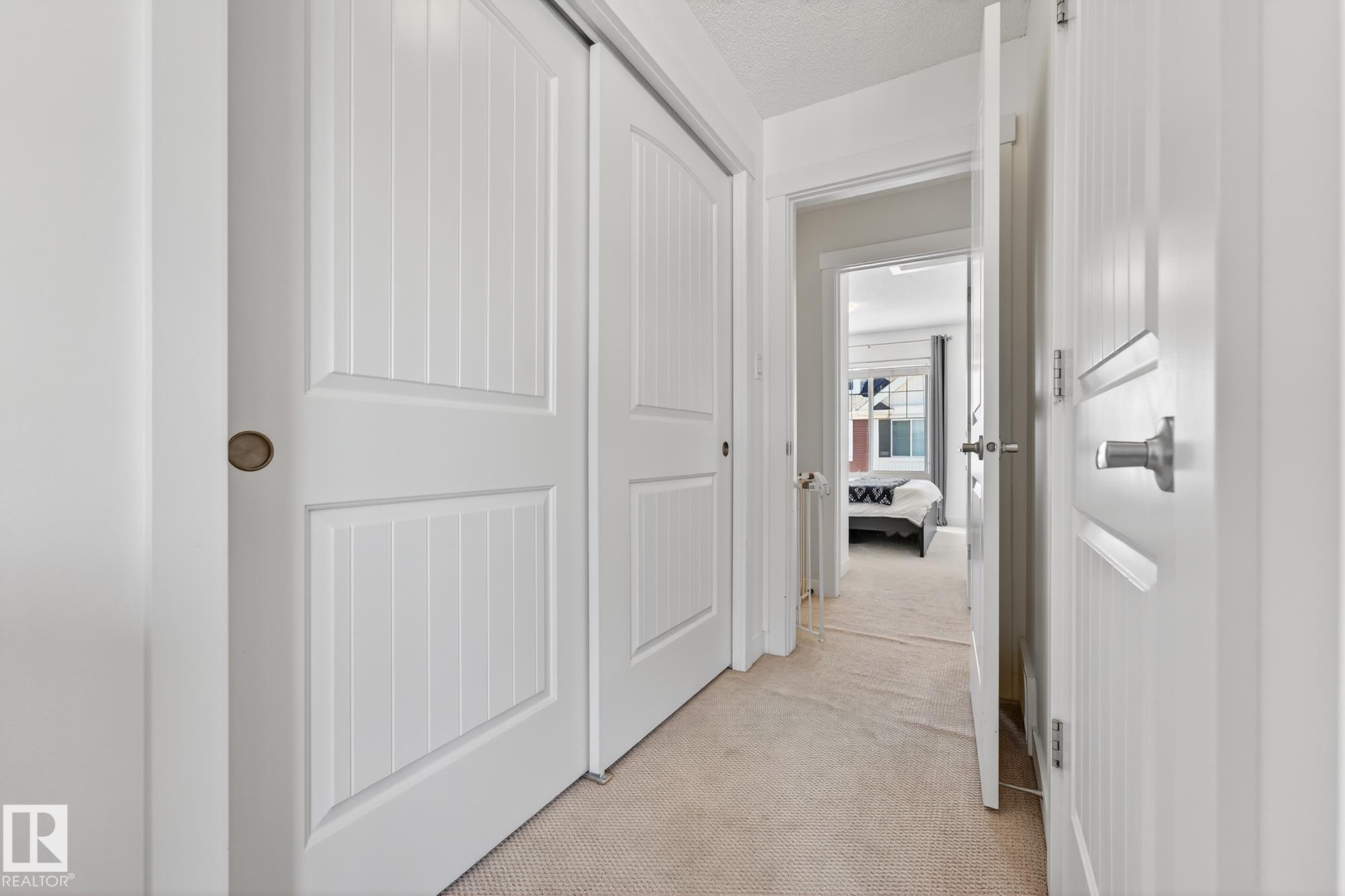 SELLER OPEN TO SHOWING WHILE PENDING. Freshly painted. 3 storey townhome w/DOUBLE attached garage overlooks green courtyard. 3 bed/2.5 baths. Top floor offers 3 beds, 4-pce bath & laundry (full-sized front load). Primary fits king bedroom set and has 3-pce ensuite plus 2 closets. Main floor is bright, with 9' ceilings, open-concept layout. Gourmet kitchen with quartz counters, soft-close drawers, pantry, stainless steel appliances, island with breakfast bar. Large dining & living room. Private balcony, complete with BBQ gas hookup. Entry level includes bonus area perfect for office, playroom, or gym, and opens to quiet greenspace ideal for kids or pets. Double attached garage is fully finished (drywall, vapour barrier, insulation to keep warm). Tons of visitor parking + ample extra parking on street. Furnace filter replaced regularly. Close to Anthony Henday, CFB Edmonton, schools, parks & shopping. Dog friendly: 2 allowed. 1543 Sq Ft Taxes $2950 for 2025. Possession negotiable, quick possession avail.