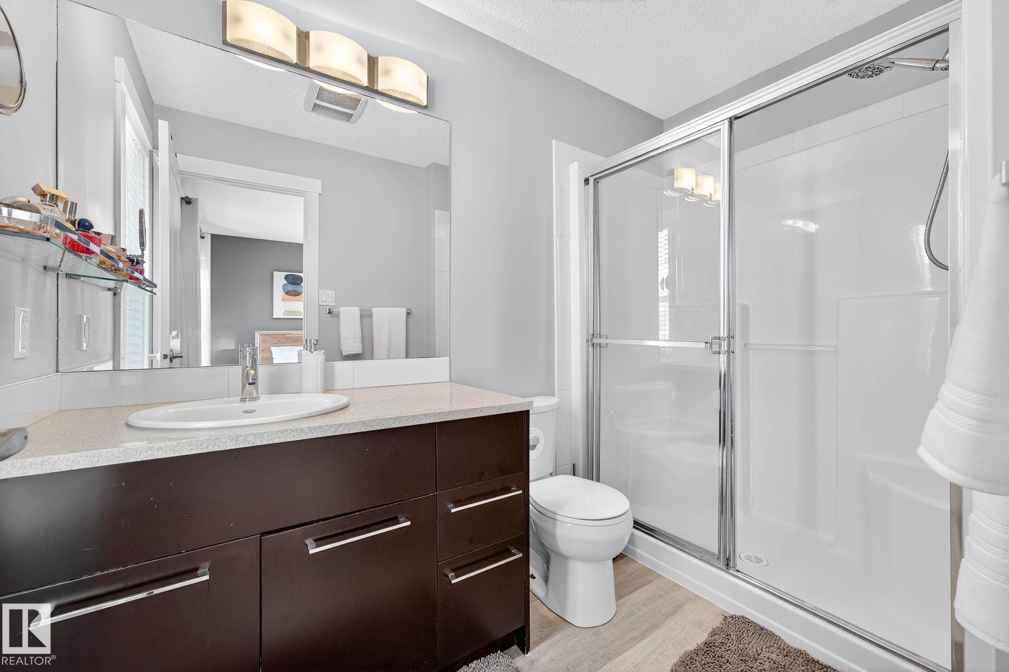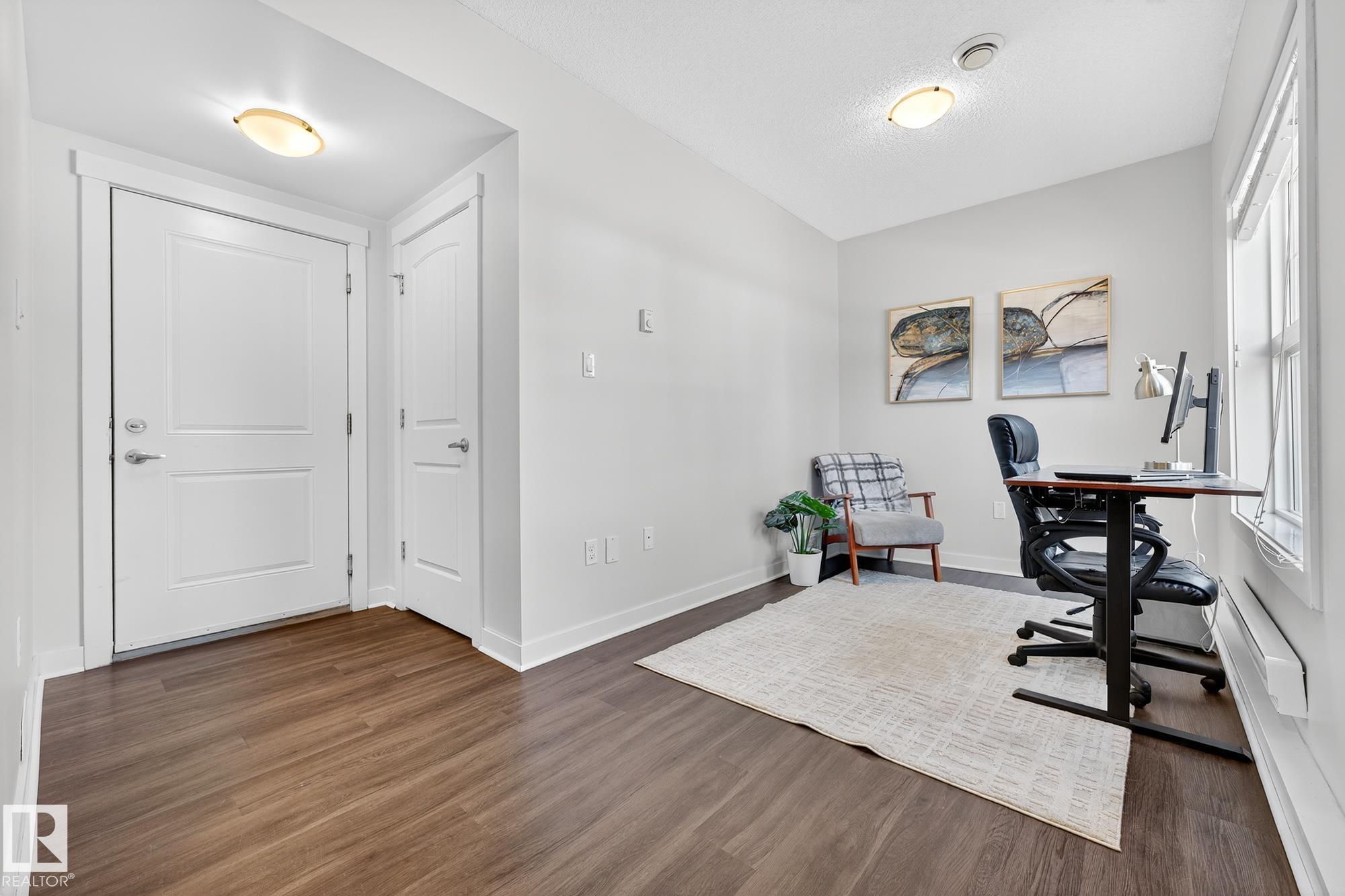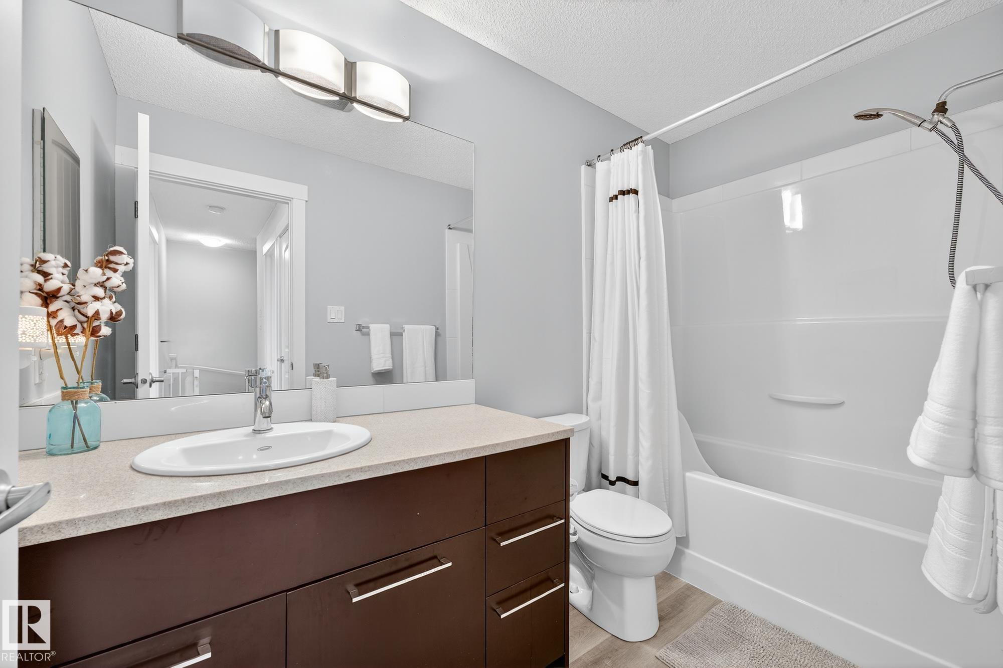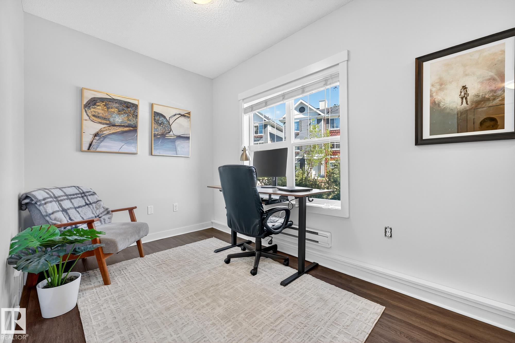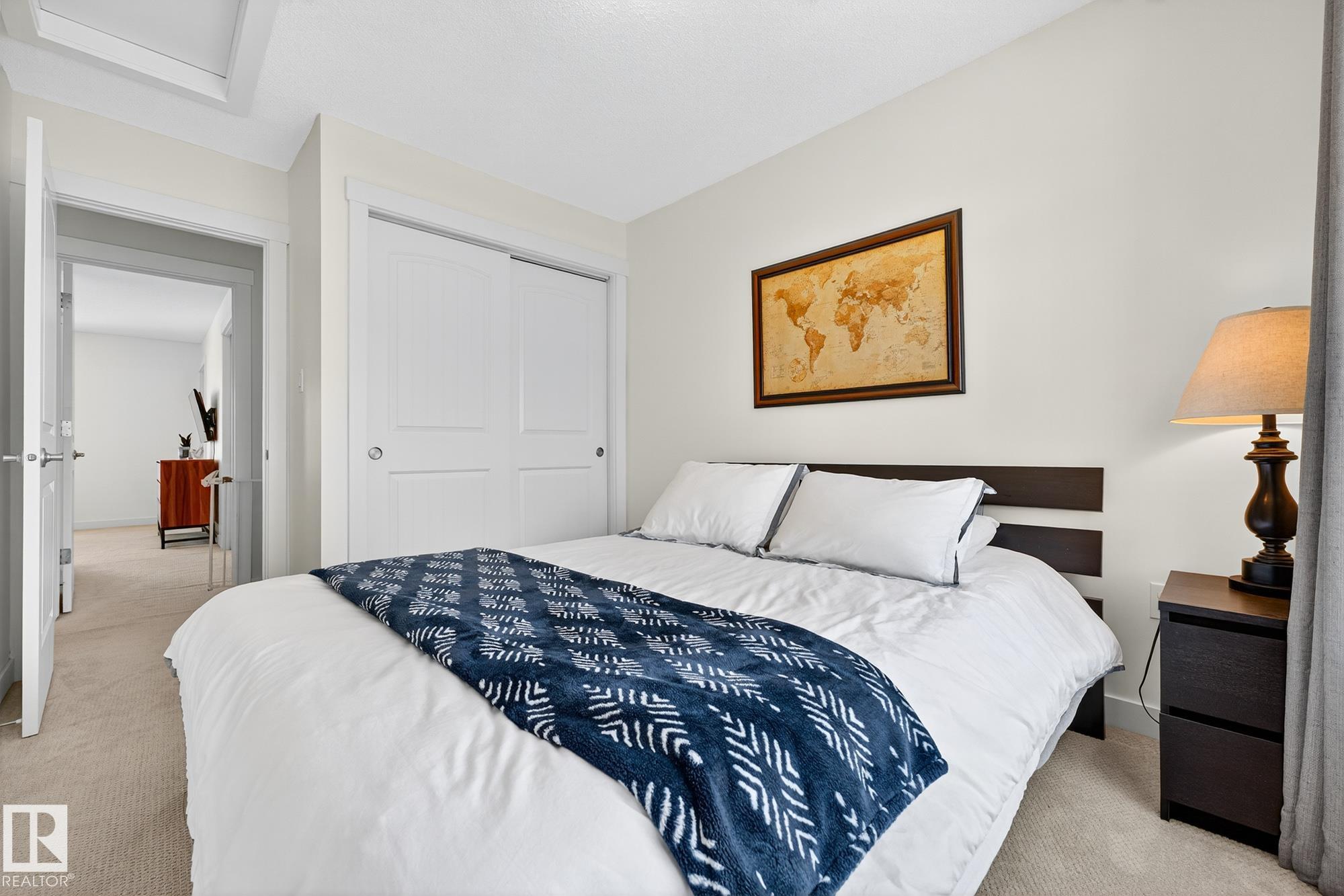 SELLER OPEN TO SHOWING WHILE PENDING. Freshly painted. 3 storey townhome w/DOUBLE attached garage overlooks green courtyard. 3 bed/2.5 baths. Top floor offers 3 beds, 4-pce bath & laundry (full-sized front load). Primary fits king bedroom set and has 3-pce ensuite plus 2 closets. Main floor is bright, with 9' ceilings, open-concept layout. Gourmet kitchen with quartz counters, soft-close drawers, pantry, stainless steel appliances, island with breakfast bar. Large dining & living room. Private balcony, complete with BBQ gas hookup. Entry level includes bonus area perfect for office, playroom, or gym, and opens to quiet greenspace ideal for kids or pets. Double attached garage is fully finished (drywall, vapour barrier, insulation to keep warm). Tons of visitor parking + ample extra parking on street. Furnace filter replaced regularly. Close to Anthony Henday, CFB Edmonton, schools, parks & shopping. Dog friendly: 2 allowed. 1543 Sq Ft Taxes $2950 for 2025. Possession negotiable, quick possession avail.