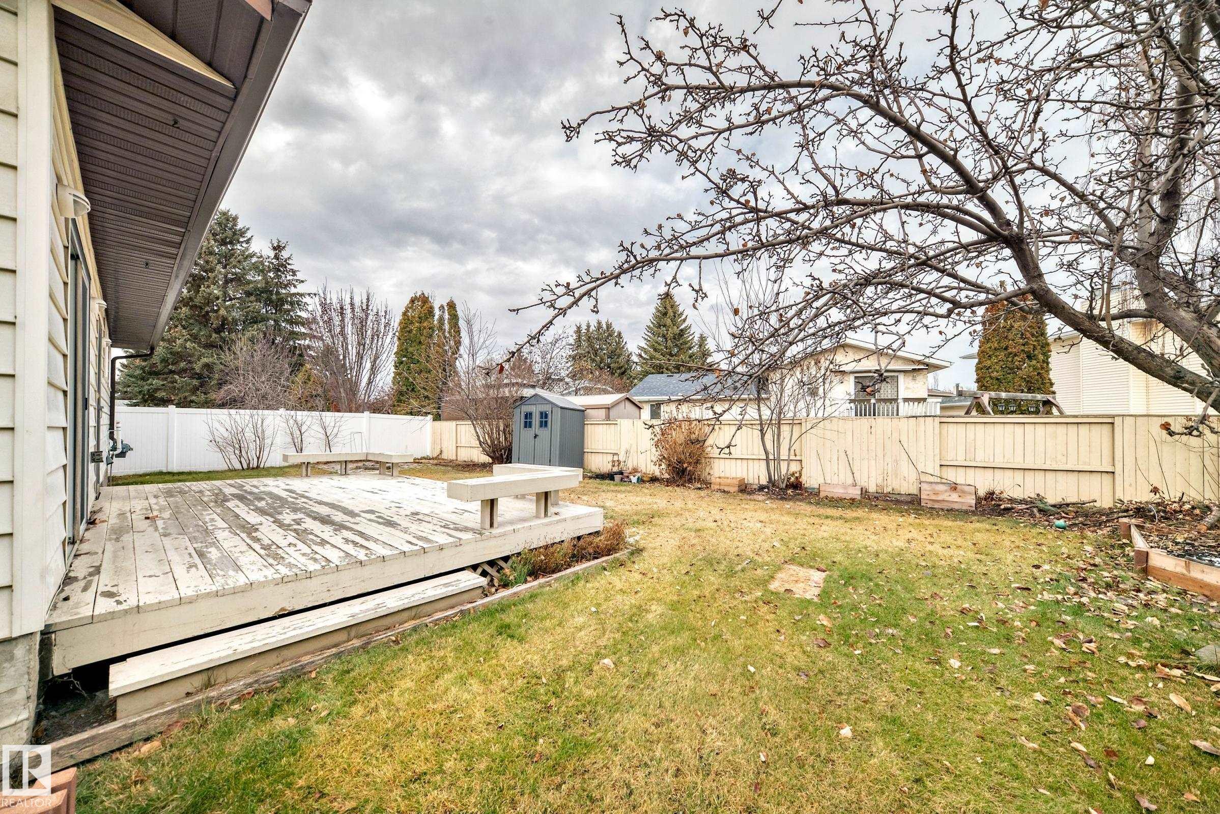 This spacious and upgraded bungalow is situated in the coveted Meyokumin neighborhood. This house has a double attached garage and a CUL-DE-SAC layout. This property features a specious living room, family room which has nine-foot ceilings, a fireplace, and patio doors that lead to your deck, is accessible from the kitchen, In addition to new windows and binds, the entire house has been painted recently. in 2025, the gutters, humidifier, and furnace were replaced. The basement has a sizable recreation area with lots of built-ins and an amazing amount of storage space. There is also a fourth bedroom, a four-piece bathroom, and a roughed-in wet bar. There is an additional entrance that provides access to the basement. The backyard features a fire pit, storage sheds, trees, and more. This fantastic location offers quick access to Anthony Henday Drive, 50th St., and schools, parks, and retail establishments.