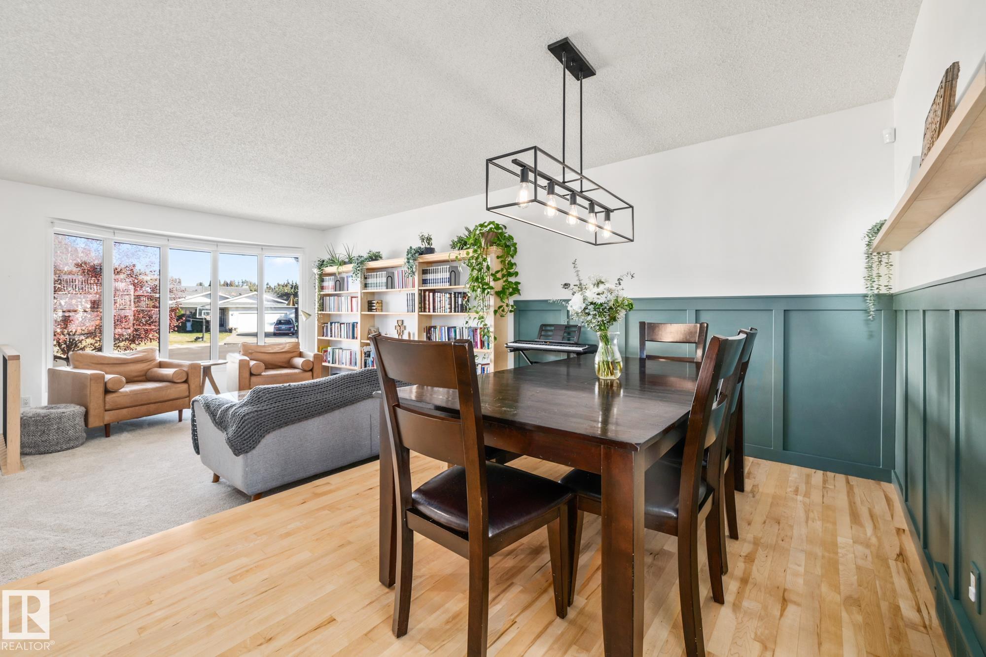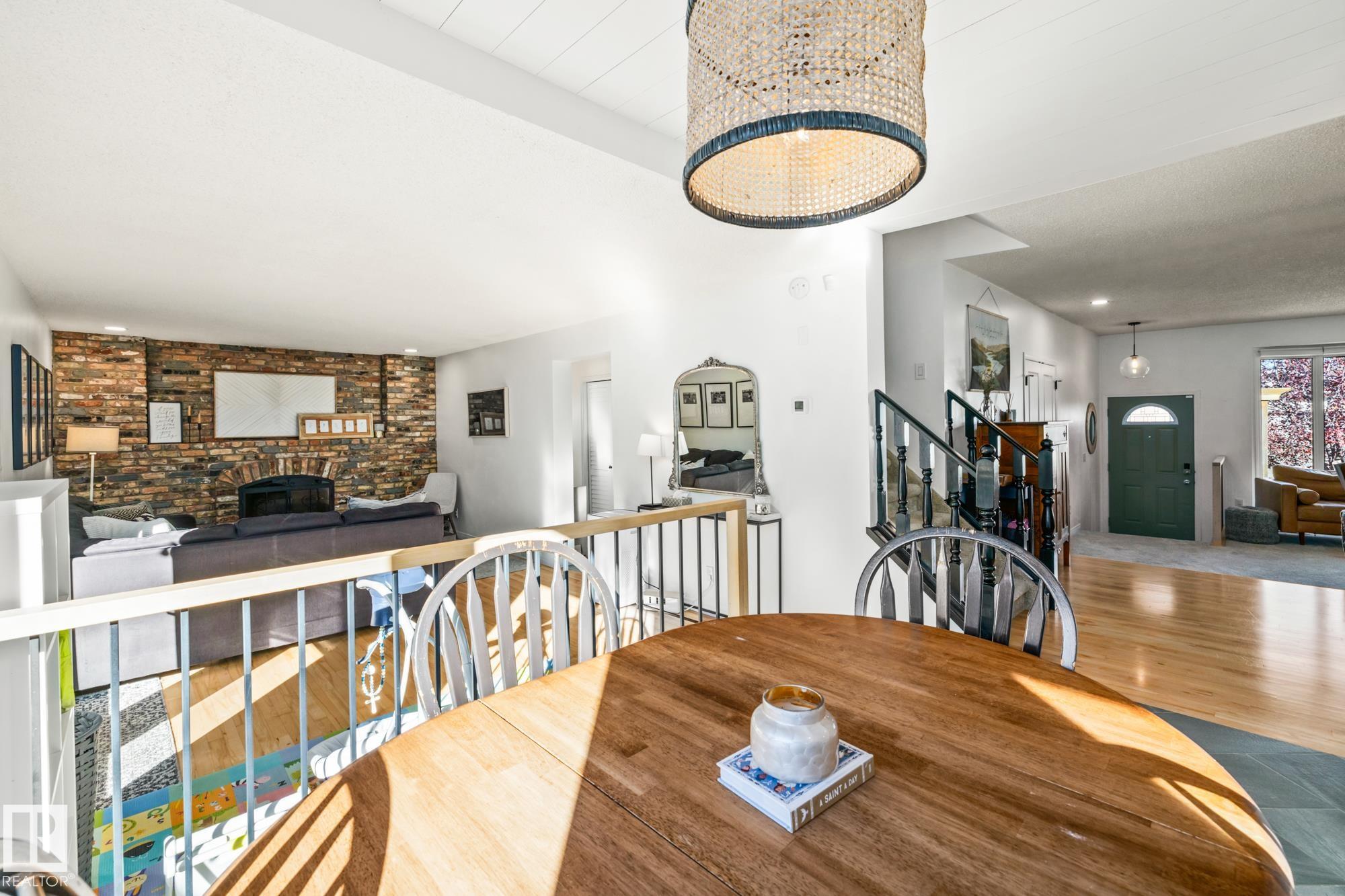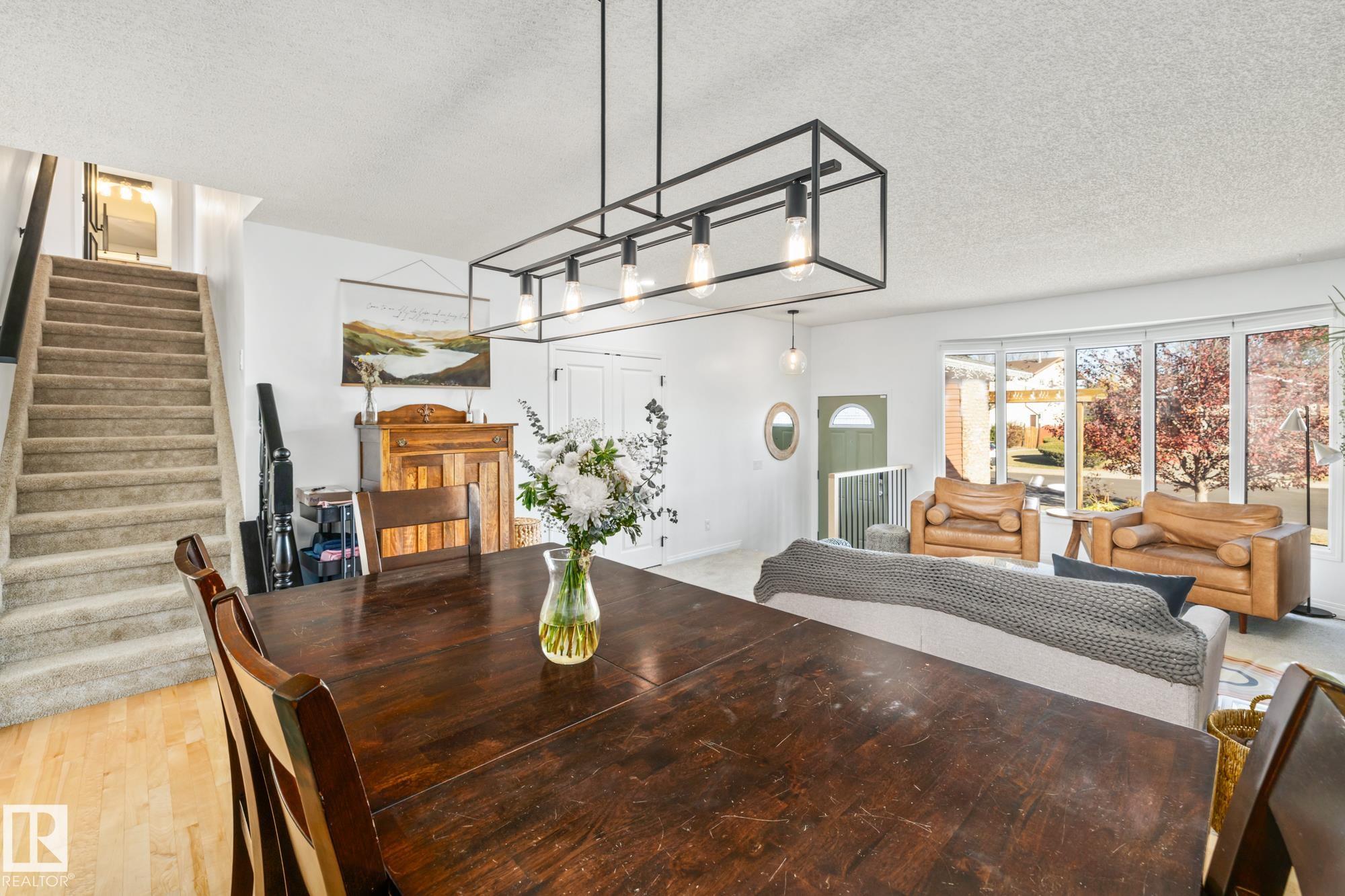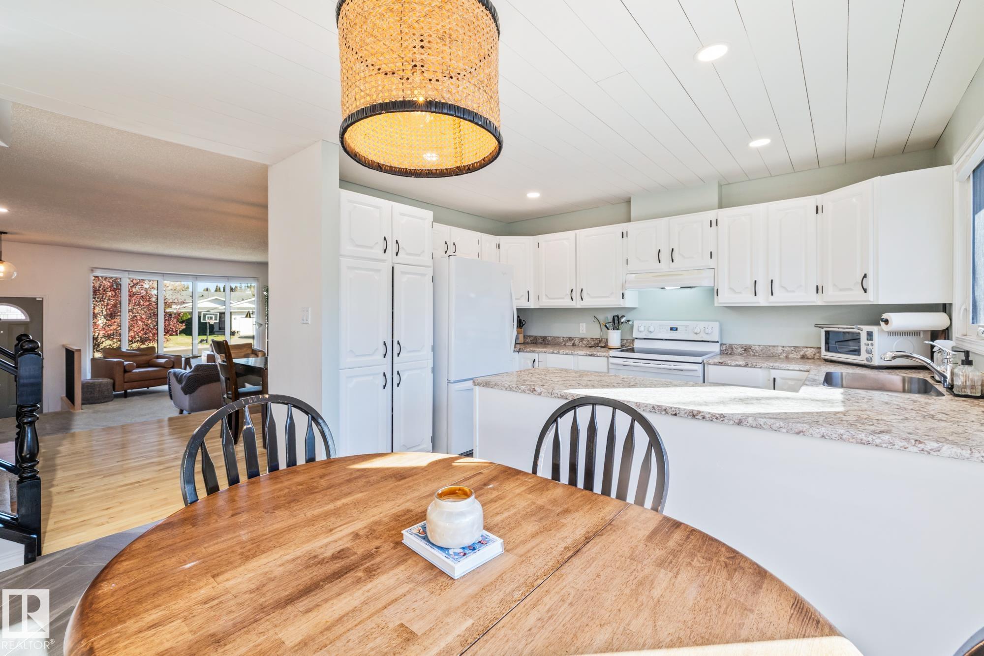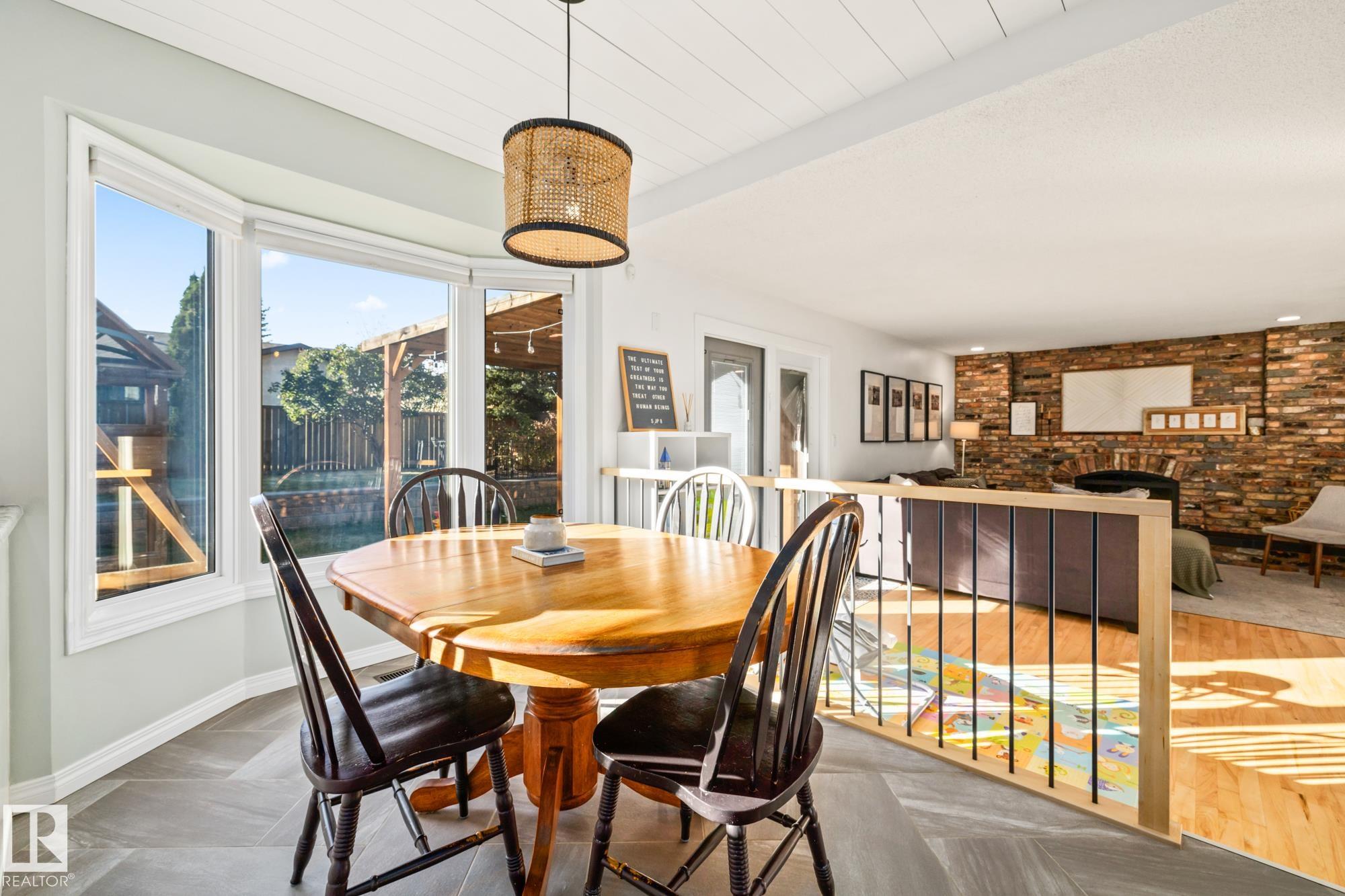 Beautifully renovated and perfectly located, this turnkey 2 storey in Ormsby Place sits in a quiet cul-de-sac across from Willowby Park. With 5 bedrooms and 3.5 baths, it's the ideal home for families seeking space, style and a move-in ready property in west Edmonton. The main floor features sun-filled living and dining with curved bay window, board and batten detail and custom wall-length bookshelves, while the family room centers around a brick fireplace. The bright eat-in kitchen shines with white cabinetry, plank ceiling, recessed lighting, peninsula island, new appliances and walkout access to the yard. Upstairs offers a generous primary suite with private ensuite, 2 bedrooms and a family bath. A main floor bedroom and bath add flexibility, and the finished basement provides a 5th bedroom, bath, rec area & play rm. Outside enjoy a fenced yard with pergola, brick patio, garden beds and mature trees. Extensive updates include kitchen, baths, flooring, lighting, paint, railings, laundry and garage door.