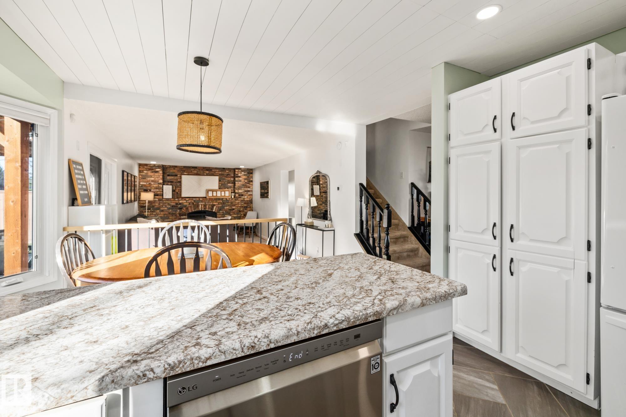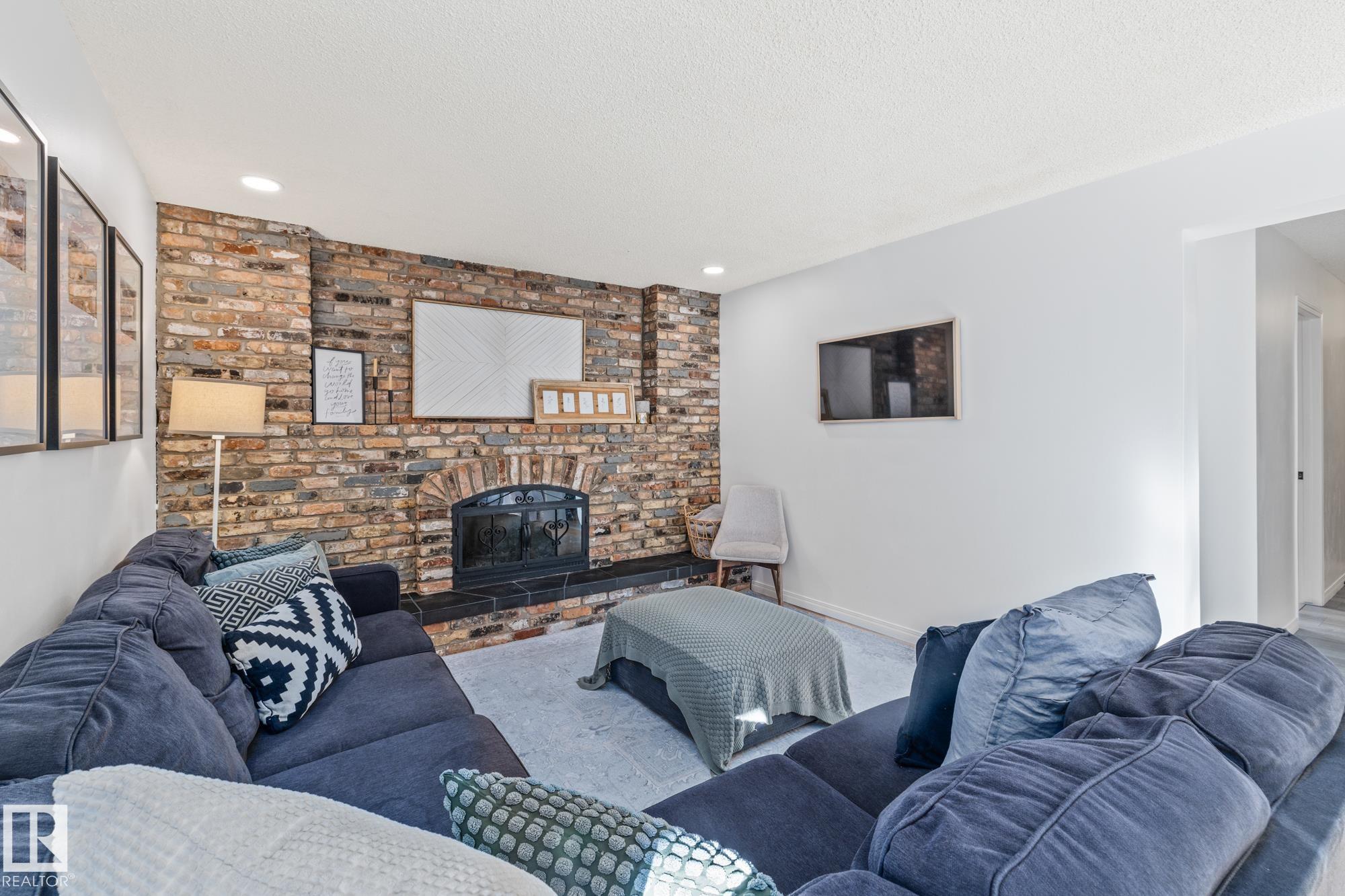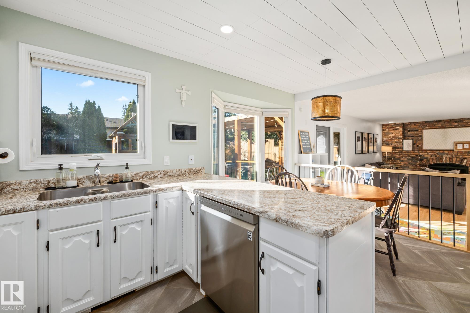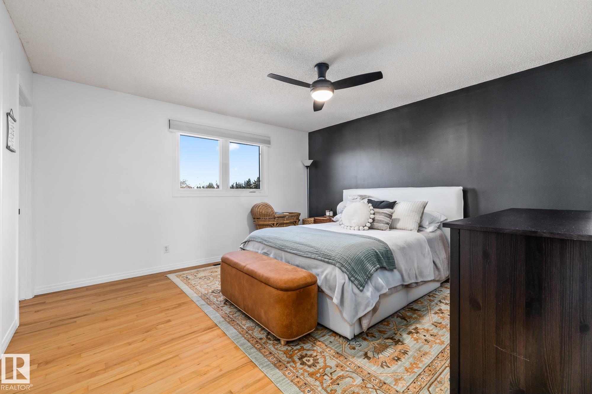 Beautifully renovated and perfectly located, this turnkey 2 storey in Ormsby Place sits in a quiet cul-de-sac across from Willowby Park. With 5 bedrooms and 3.5 baths, it's the ideal home for families seeking space, style and a move-in ready property in west Edmonton. The main floor features sun-filled living and dining with curved bay window, board and batten detail and custom wall-length bookshelves, while the family room centers around a brick fireplace. The bright eat-in kitchen shines with white cabinetry, plank ceiling, recessed lighting, peninsula island, new appliances and walkout access to the yard. Upstairs offers a generous primary suite with private ensuite, 2 bedrooms and a family bath. A main floor bedroom and bath add flexibility, and the finished basement provides a 5th bedroom, bath, rec area & play rm. Outside enjoy a fenced yard with pergola, brick patio, garden beds and mature trees. Extensive updates include kitchen, baths, flooring, lighting, paint, railings, laundry and garage door.