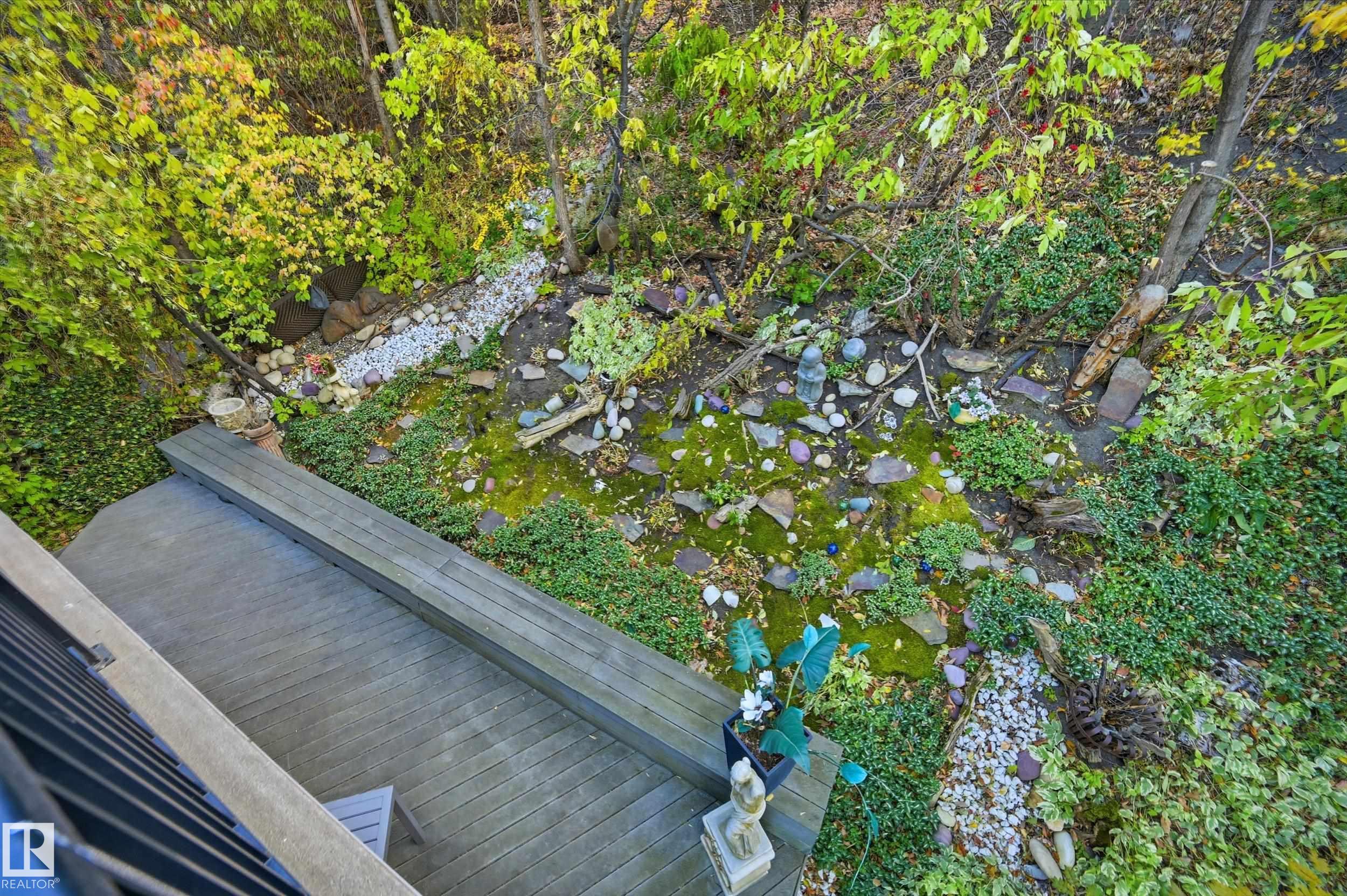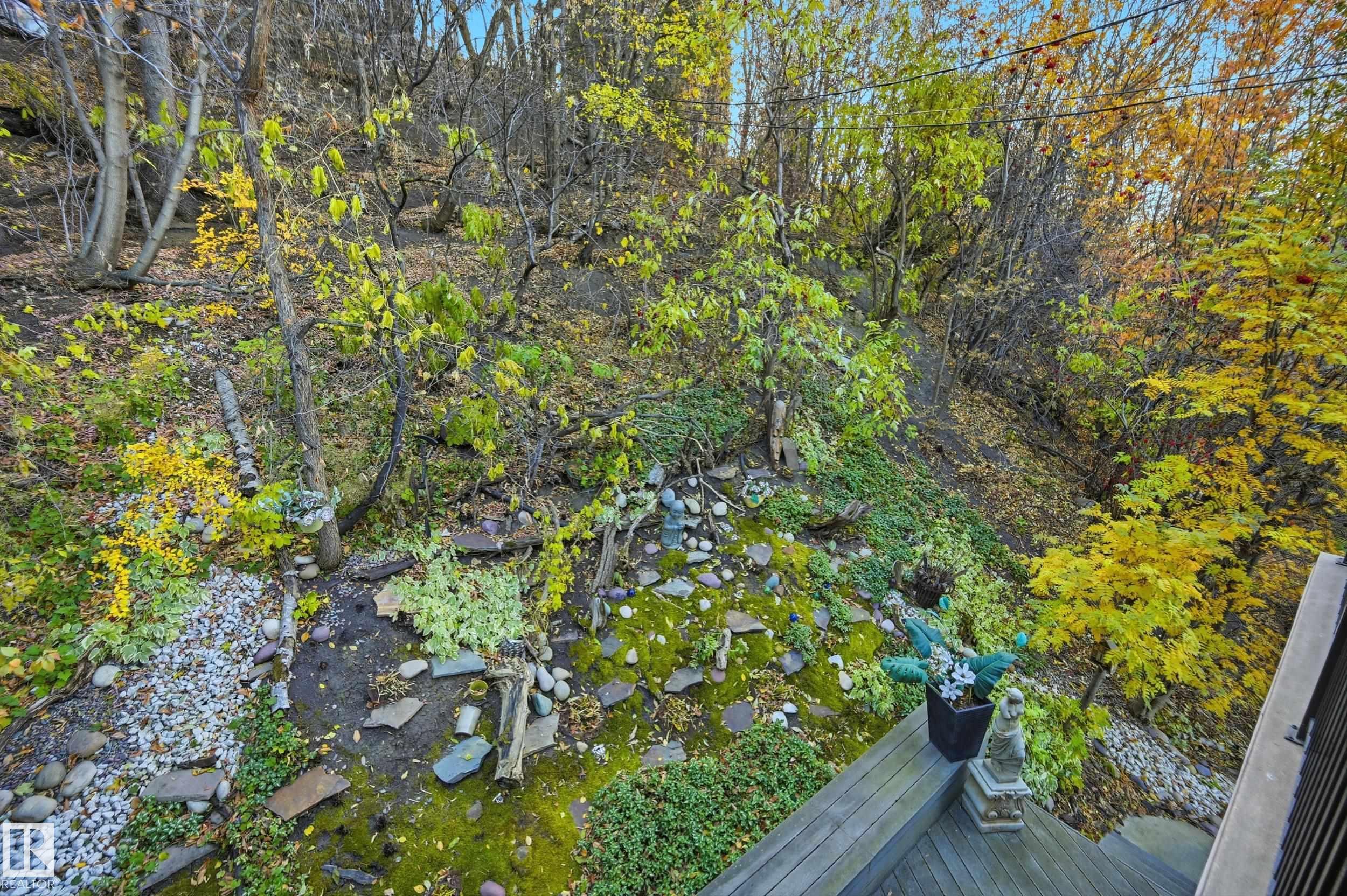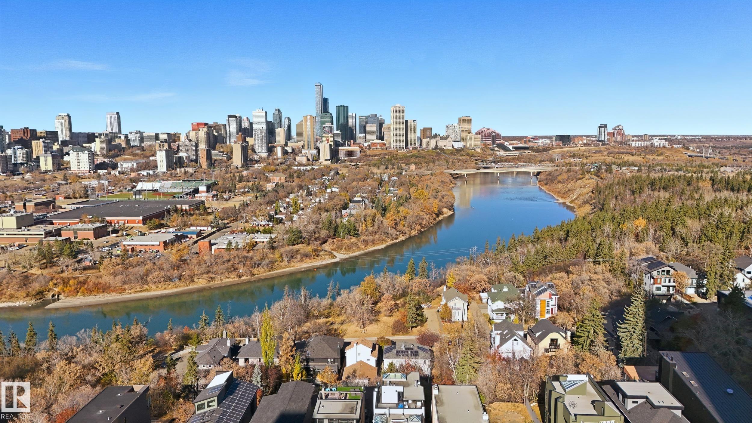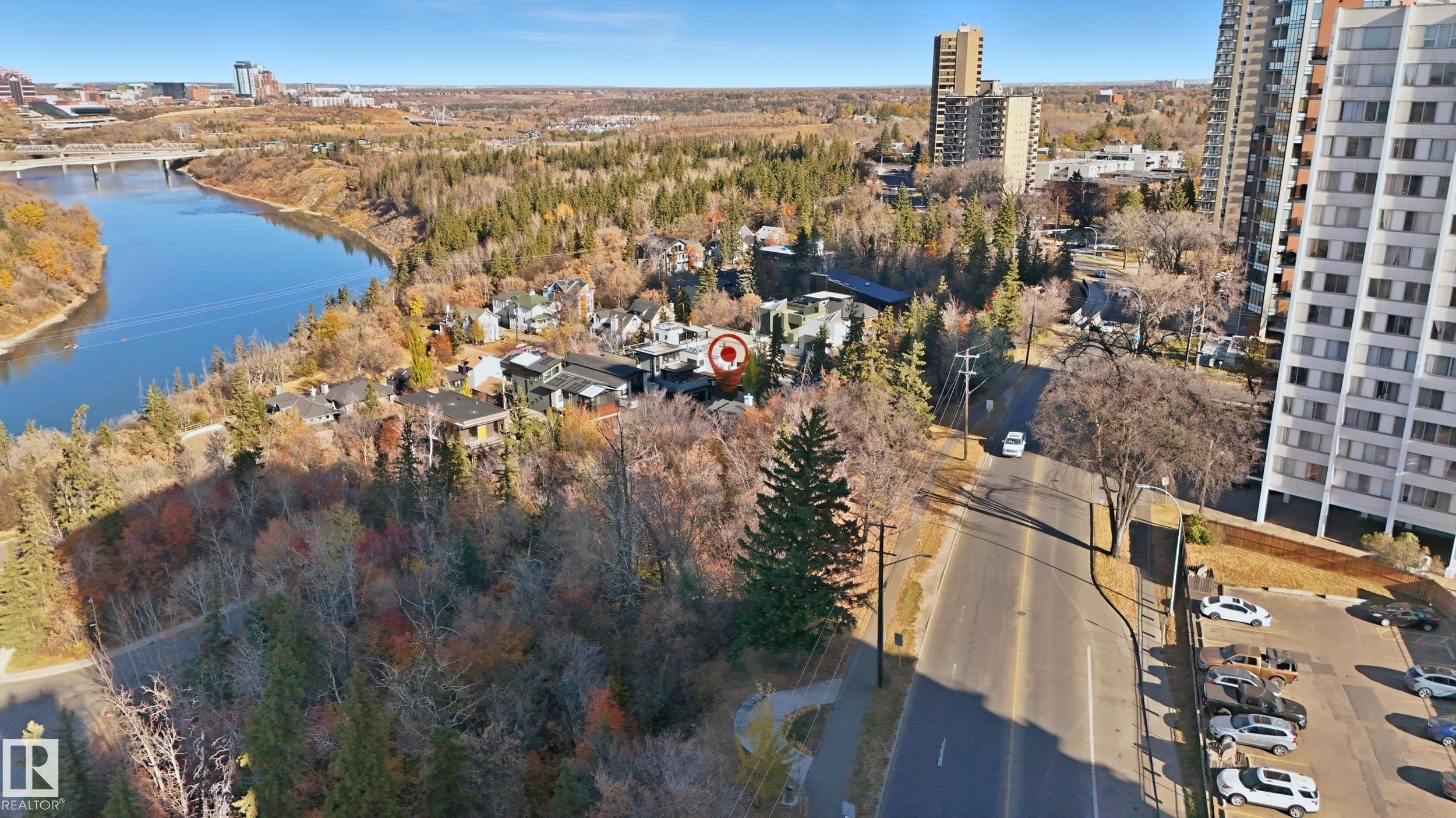 ARCHITECTURAL GEM IN EDMONTON'S RIVER VALLEY! Tucked into the quiet enclave of Skunk Hollow, this modern home blends thoughtful design with rare privacy. Rebuilt from the frame up in 2007, it offers clean lines, warm natural light, and a calm connection to its ravine setting. Large windows frame views of the trees by day and city lights by night. The open main floor features two inviting living areas and a chef's kitchen with Sub-Zero and Miele appliances, perfect for cooking or entertaining. Upstairs, the owner's retreat includes a private office, flex space, spa-inspired ensuite, and expansive walk-in closet with access to a peaceful patio. The reverse walkout lower level offers a heated epoxy garage, full bath, and guest/flex room (no window), with in-floor heating throughout. Opportunity exists to add additional bedrooms. NOTE: 3D renderings illustrate potential future layouts. Garage photo virtually staged.